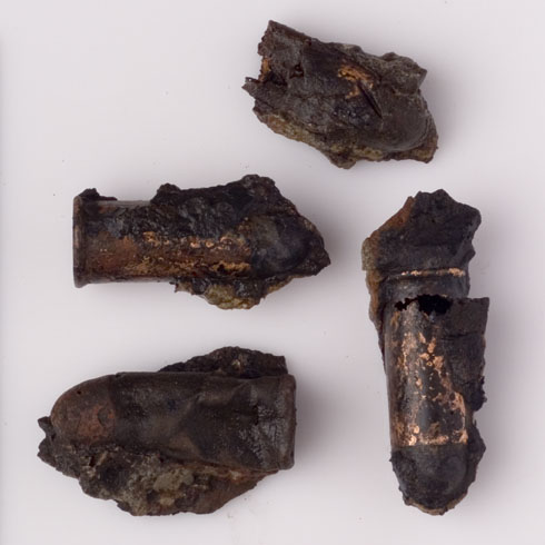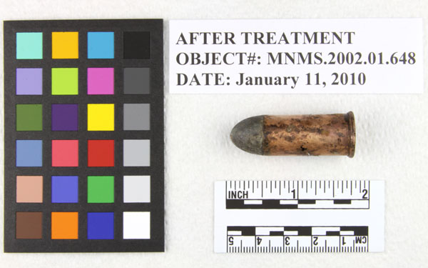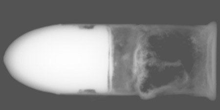 在对枪管进行处理之前,采用了几种非破坏性的分析方法。对完整的弹药筒进行x光拍摄,以便文物保护人员了解物体的内部状况,并识别隐藏在混凝土材料下的弹药部件。x射线还提供了无需拆卸物体就能了解子弹结构的线索。从一个弹壳的x射线图像可以看到,该球有一个后跟(使球与弹壳齐平的凹陷处),其中有一个凹槽,还可以对该球进行测量。