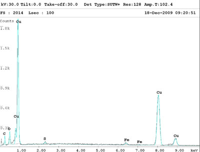 与今天的弹壳由黄铜(铜和锌)组成不同,早期的金属弹壳主要由铜组成。为了了解我们的弹壳是由什么组成的,将弹壳碎片放入扫描电子显微镜(SEM)中,发现碎片是由铜组成的。