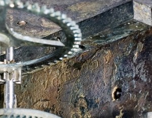 在神器的外部没有找到识别标志,但在拆卸擒摇机构时有了一个令人兴奋的发现。制造者的名字是V。吉鲁(Victor Giroud)被发现在擒纵盘的内侧。根据吉姆的说法,Victor Giroud老和Jr.是19世纪40年代以来纽约市著名的钟表制造商,并获得了几项专利,包括在1863年获得的“改进船用钟”专利。许多其他内战时期美国海军时钟利用吉鲁运动,包括美国航空母舰的时钟铁甲军在弗吉尼亚州诺福克的汉普顿路海军博物馆收藏。吉姆和罗杰检查了19世纪60年代维克多·吉鲁钟表的7个已知样品中的许多,能够为理解其工作原理提供宝贵的帮助监控的时钟。