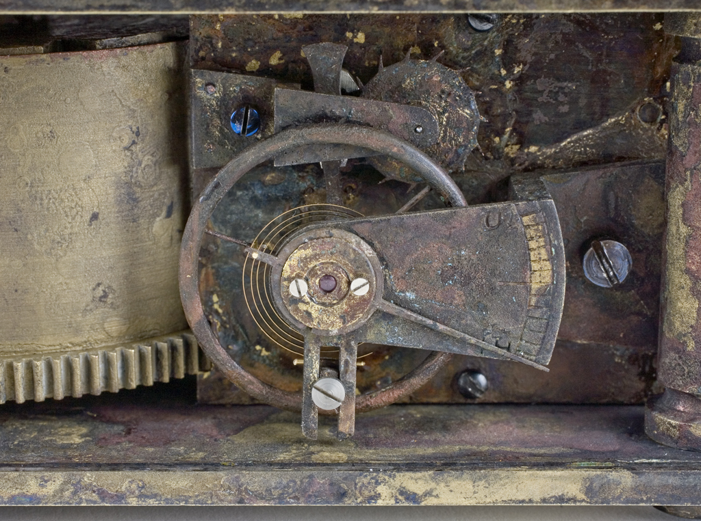 在纽波特纽斯杰斐逊实验室应用研究中心的威廉玛丽学院材料表征实验室进行的元素分析证实了一些成分中含有镍。这一分析为选择最合适的保护处理方法提供了有价值的指导。然而,那些由钢制成的精致的弹簧、螺丝和齿轮轴(被称为叶柄)就不那么好用了,除了主弹簧的一些残余部分外,它们已经完全锈掉了。