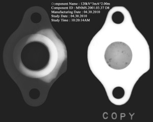 在这幅图中,我们可以看到左边的是保留的阻尼活塞阀盖,右边是复制的活塞阀盖。在x射线中出现亮白色的区域对应于物体中实际的铁含量。之所以会出现白色,是因为这些区域的金属密度足够大,即使不暴露另一面的胶片,x射线也无法穿透。工件上可见的浅灰色区域是石墨化材料,x射线可以轻易通过。拷贝中心出现浅灰色是因为金属在那一点很薄,一些x射线能够穿过它。