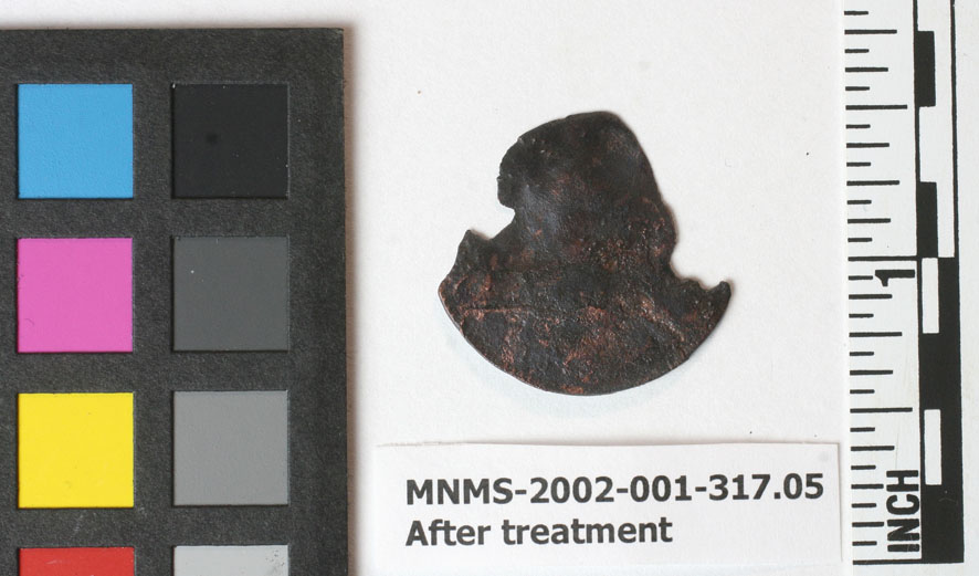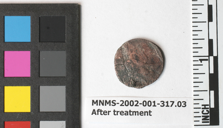 下面的第一件是最有可能的辫子头发大分。顶部的图片对应监控的硬币;他们下方的图片是在网上找到的,用于比较。在观察的一边监控在美国的硬币上(左图),人们可以隐约地辨认出自由女神像的轮廓。在背面(右图),硬币的上半部分的单词“ONE”是可读的(同样,勉强可读)。这种硬币是在1835年至1857年间铸造的。它们是大美分的最后一个版本。它们的直径为2.75厘米,100%为铜。的直径监控美国的硬币是2.55厘米。如果这是一种编发分,这种直径的损失可能与腐蚀现象有关。几周前,XRF分析了这篇文章的组成(参见Dave 8月25日的博客)th),并被测定为100%的铜!