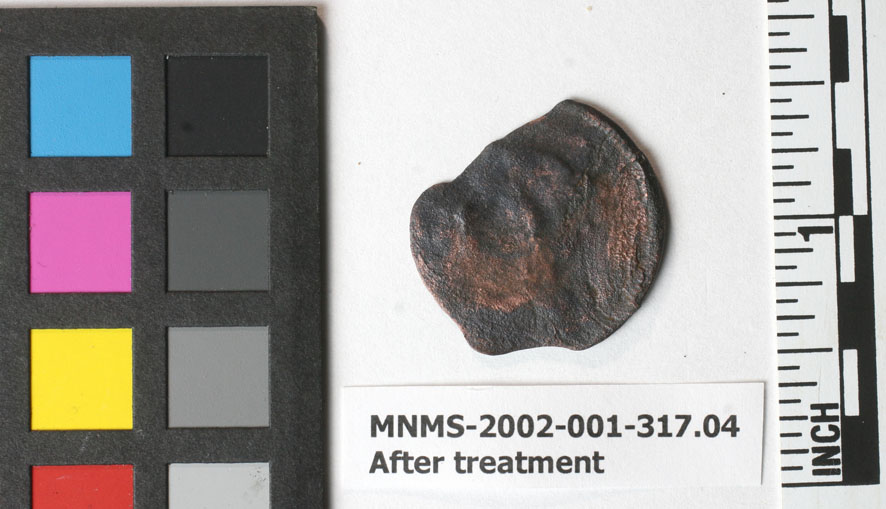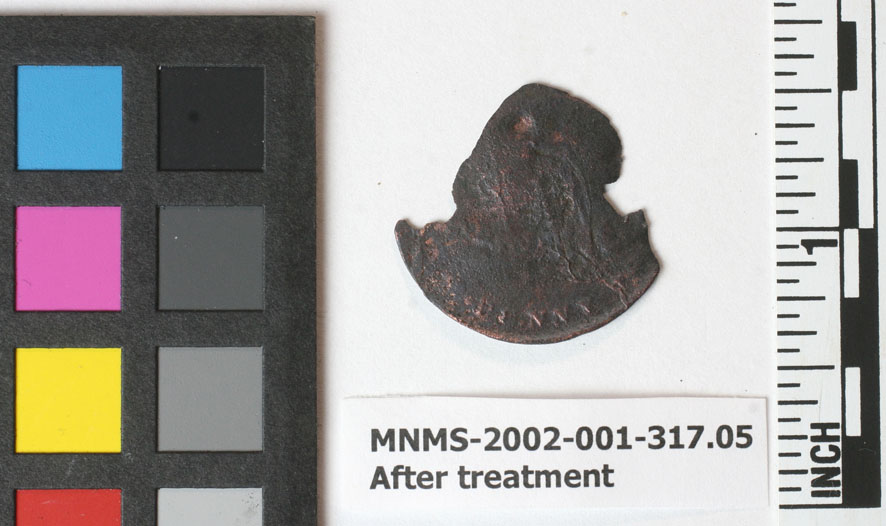 最后一枚硬币仍然是个谜。字母“F便士”在一面很容易辨认,表明它是半便士。一个日期“18 ? ?它的最大长度是2.47厘米。XRF分析告诉我们它也是由100%铜制成的。