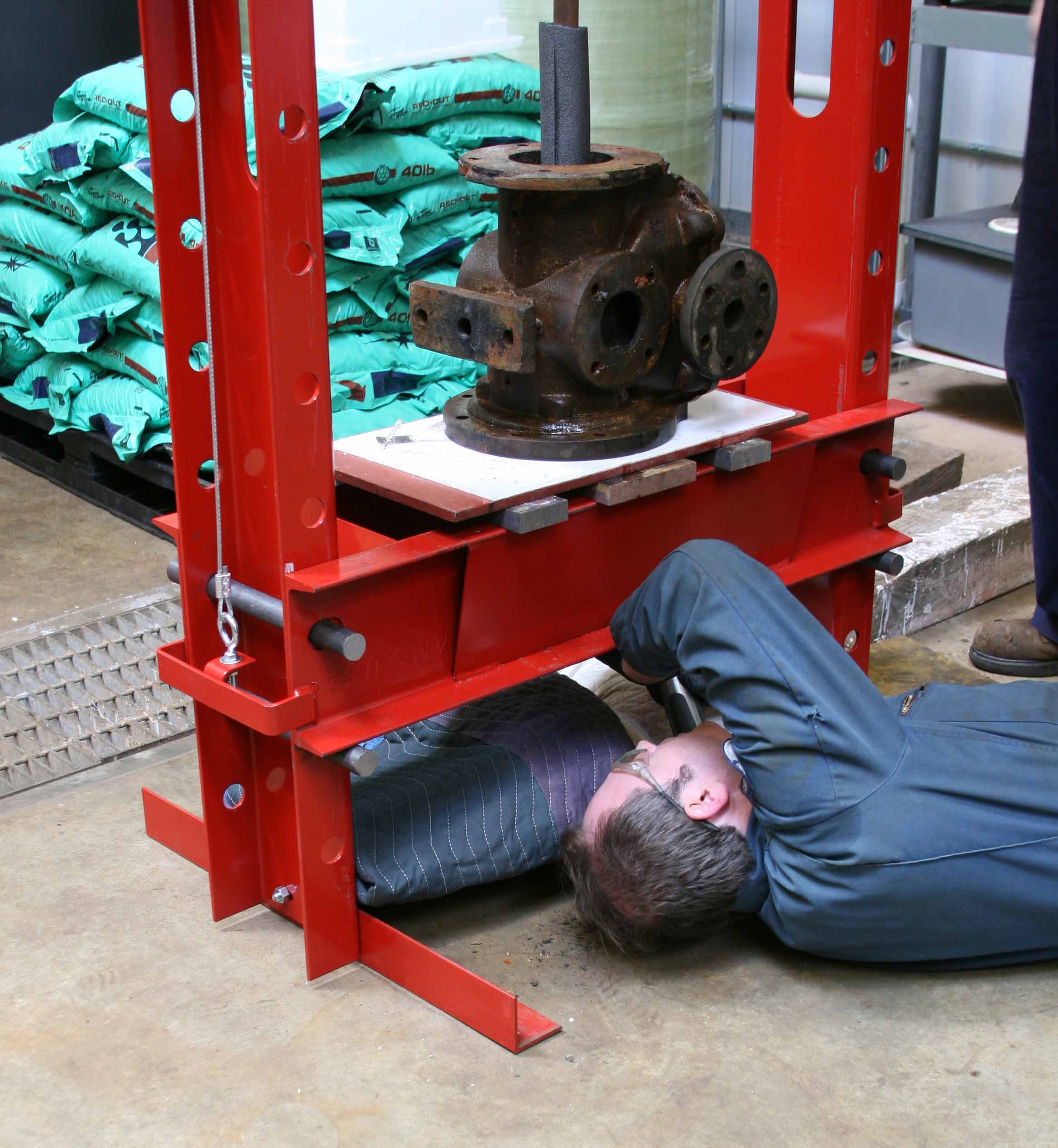 当工具准备好后,将第一个水泵块放入压力机中,并小心地施加压力。几乎不需要什么努力,柱塞就开始移动了!
