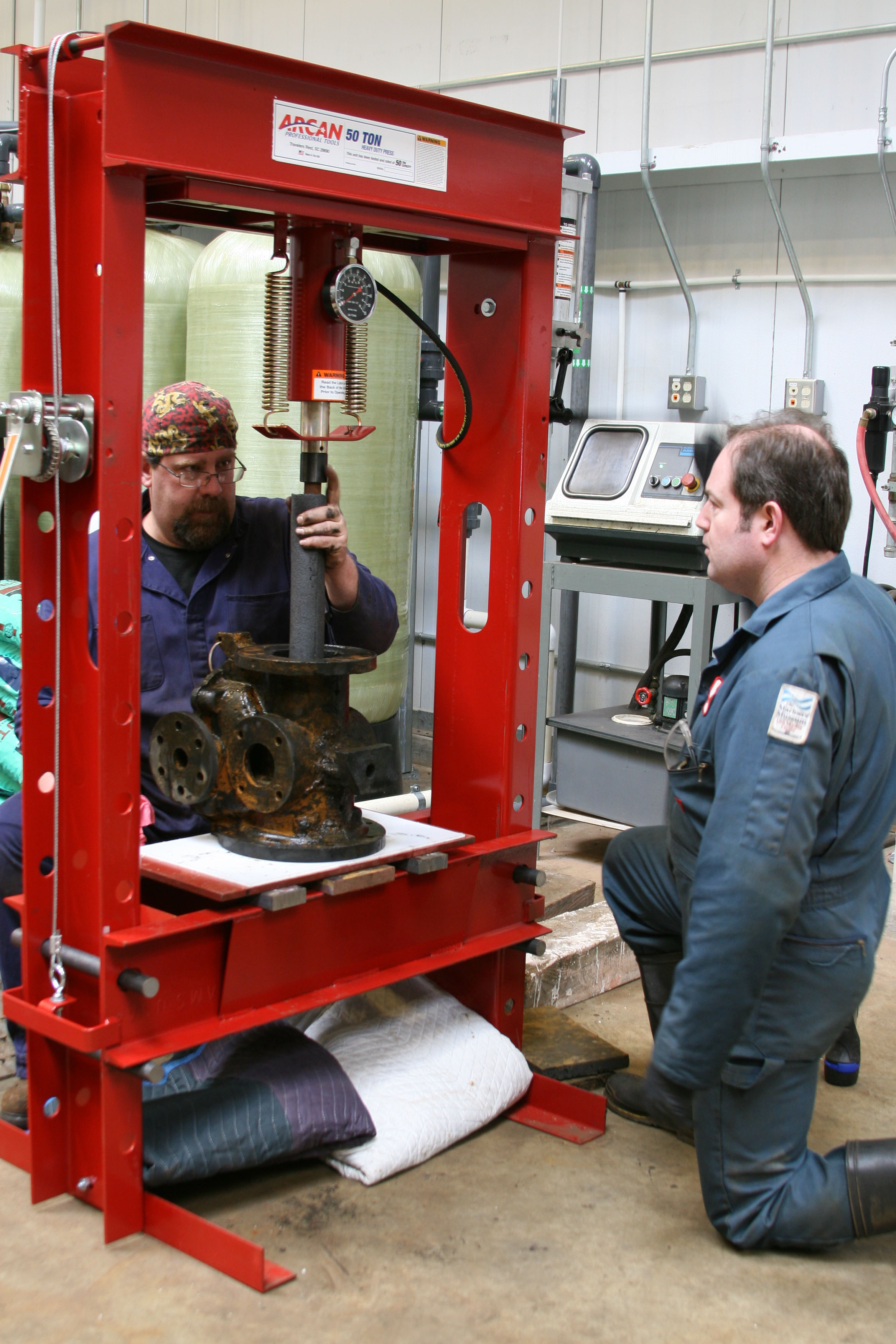 周三,沃辛顿泵的内部部件继续被移除,使用的是液压机和一种专门制造的工具,用于对泵中的黄铜水柱塞施加均匀的压力,并将它们安全地推出。