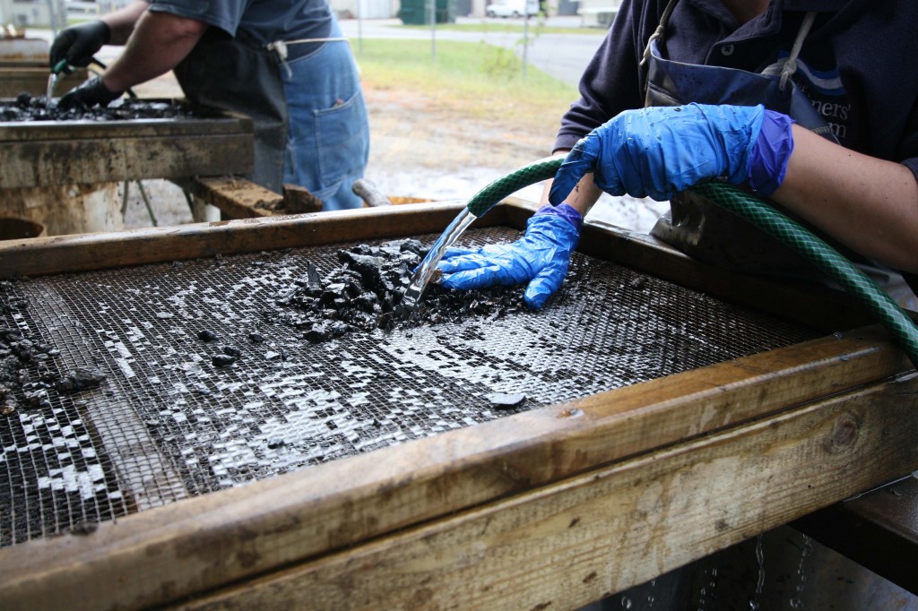 过去的这一周监控文物保护工作人员在过去10周内开始筛选从炮塔内部取出的固结和腐蚀产物(见主页上以前的帖子和视频链接)。与任何考古挖掘一样,我们希望确保即使是小物件和碎片也能被发现,以供未来的研究和解释。也就是说,我们选择使用一种叫做湿筛的方法。在这种技术下,不同尺寸的材料类型被分离出来,同时由稳定的水流冲刷,以去除松散的沉积物和铁锈。额外的清洗使小工件的识别更容易,并加快了整个筛选过程。