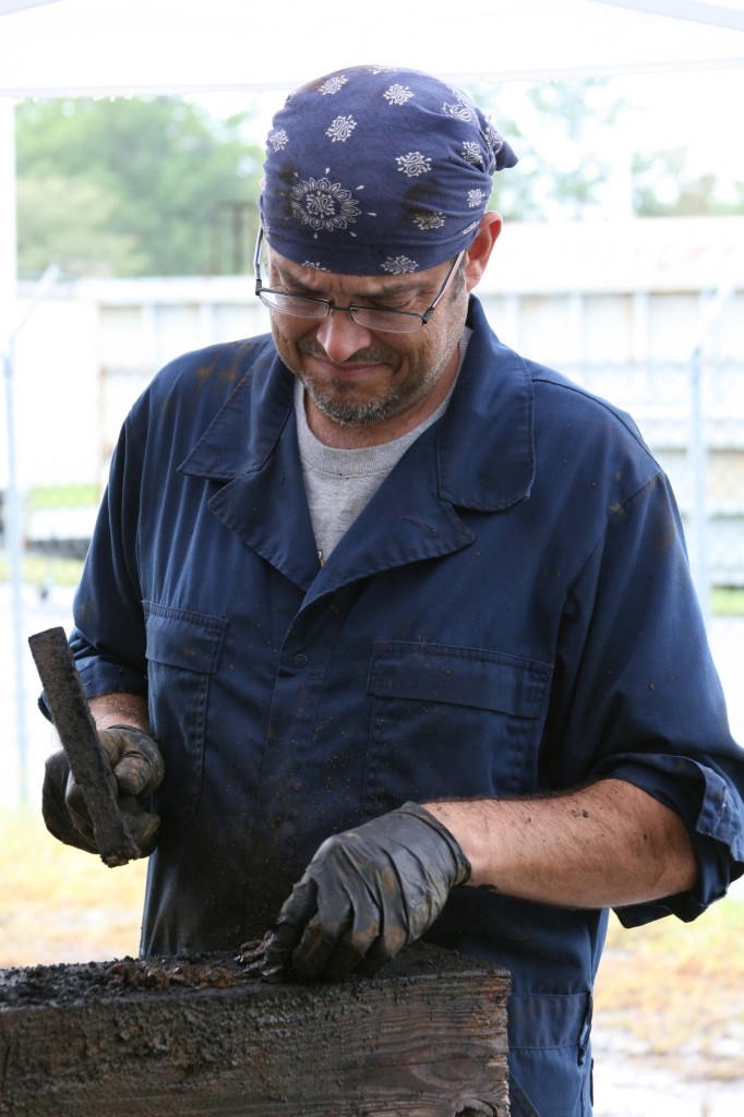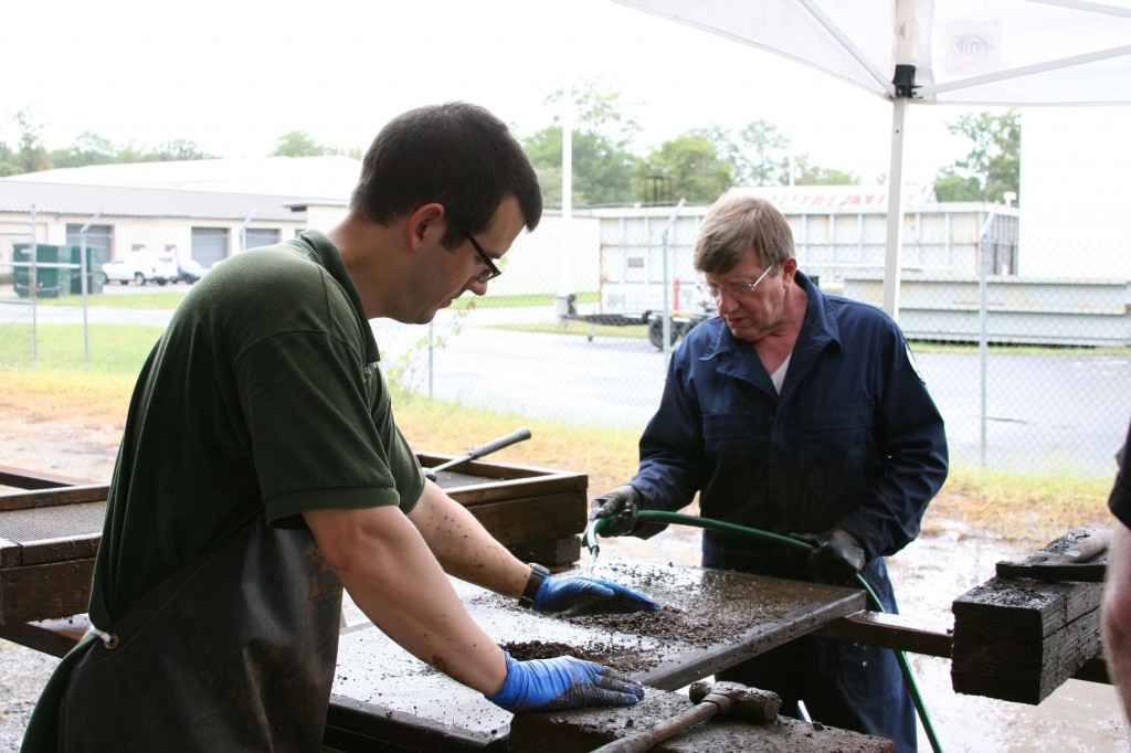 所以,此时你可能会问自己,“嘿,Will,如果大块的材料没有通过上部屏幕,它们会发生什么?”很高兴你问了!在下面的图片中,你可以看到迈克小心地用锤子打碎大块的混凝土材料。一旦变成更小的碎片,材料就会第二次通过筛子。