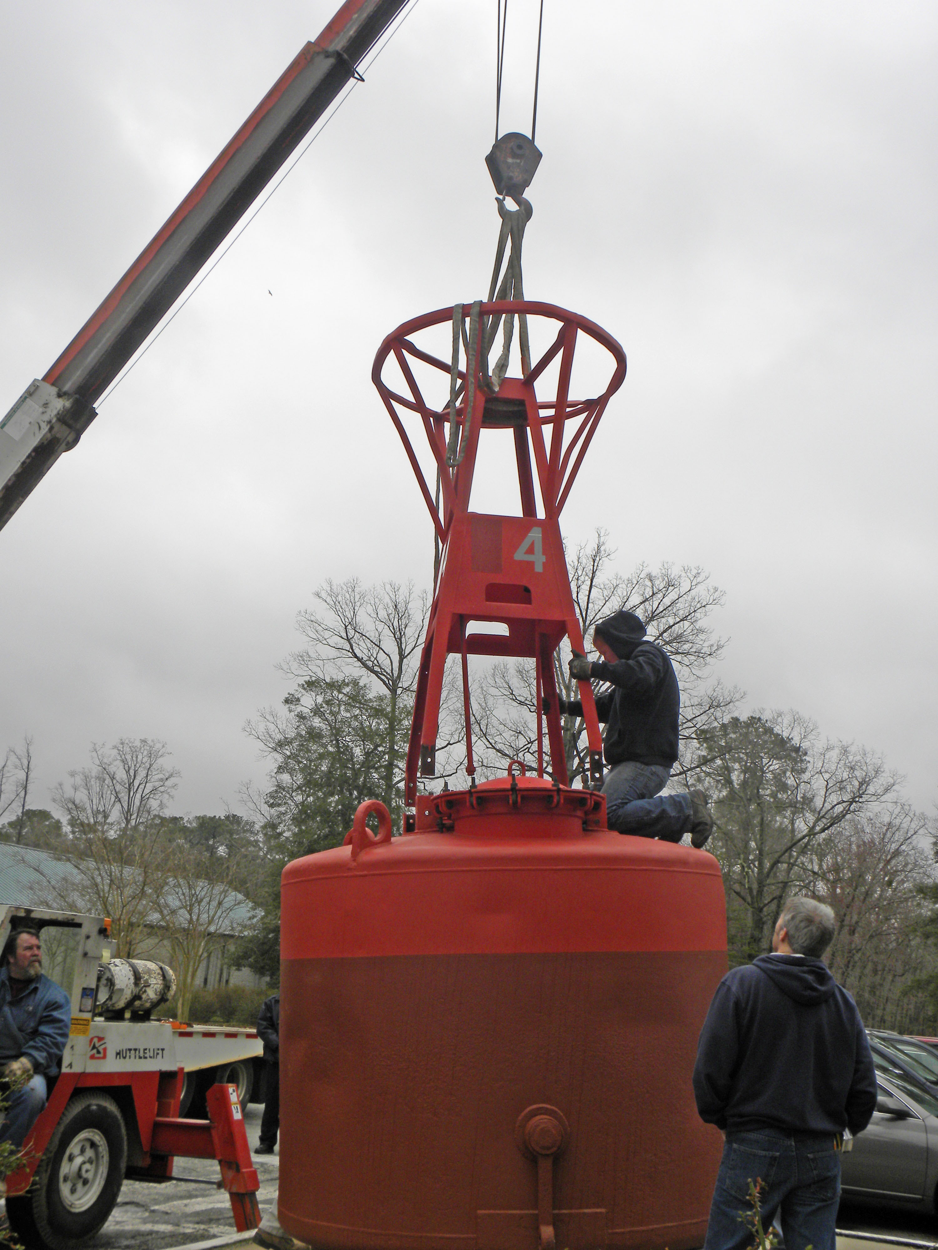 首先出现的是1952年的7X15灯海岸警卫队浮标。当它站在画廊里时,几乎碰到了天花板,所以把它拿出来是相当有趣的,因为没有太多的空间来工作。幸运的是,顶部脱落了。它现在就在我们的商业入口外面,为每个人(包括困惑的慢跑者)享受。