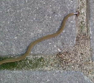 这是一只铲头的花园蠕虫。它们能长几英尺长,吃蚯蚓。不是蚯蚓养殖者的最爱,他们饲养蚯蚓卖给诱饵店。就像普通的蠕虫一样,我们通常在大雨后看到它们。