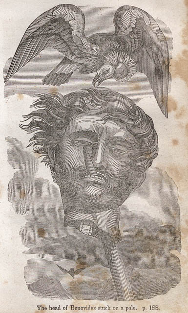 1818年,在智利革命期间投奔西班牙后,贝尼维德斯从坟墓里回来了,他和他的强盗们一起屠杀了无数阿劳坎印第安人,男人、女人和孩子来帮助西班牙军队。我说他从坟墓里回来了,因为他叛变被判了死刑,但他在被枪击和刺伤后假装死亡。在他第一次被“处决”后,他被拖走,让秃鹫吃掉,但他设法躲藏起来,直到夜幕降临,然后返回对智利进行报复。