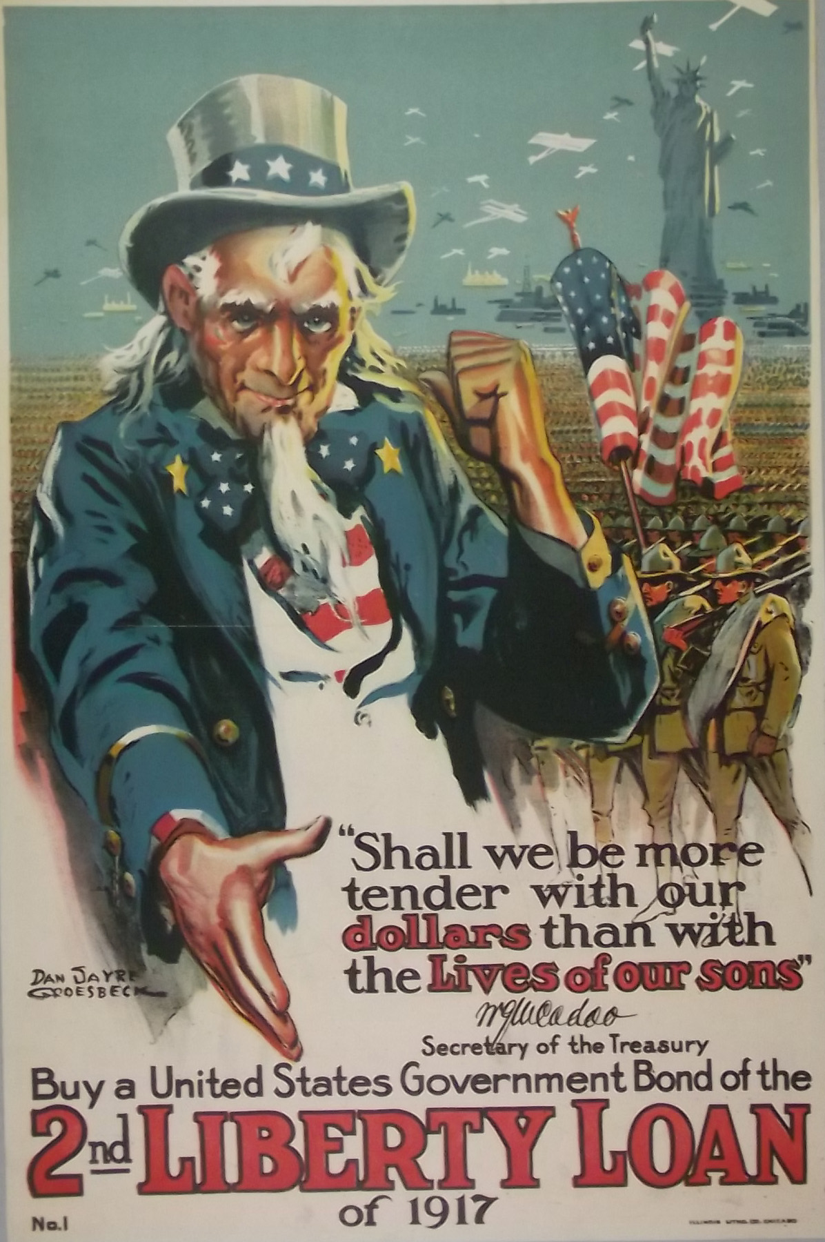 这里的第一个是宣传海报,加利福尼亚州1917年,意味着鼓励所有人为战争努力工作。它于伦敦议会招聘委员会出版,并由艺术品是由L. S. S. Baden Powell(您可以在Wikipedia上阅读他这里)。第二张海报引起了我的注意,因为山姆叔叔看起来非常激烈和令人毛骨悚然。这张海报也是来自1917年的WWI Era,并通过艺术家丹梅德·罗贝布特完成。在它的是来自财政部秘书的报价,威廉吉布斯麦迪杜。由于柔和的颜色,第三个可能是我三个三组的最爱。出于某种原因,我发现它们非常有吸引力。就像其他两个一样,这也是WWI ERA,1918年。图像是由艺术家完成的霍华德钱德勒基督教,谁以他对宣传海报的描述而闻名。我们在我们的收藏中有许多作品,他们都很棒。