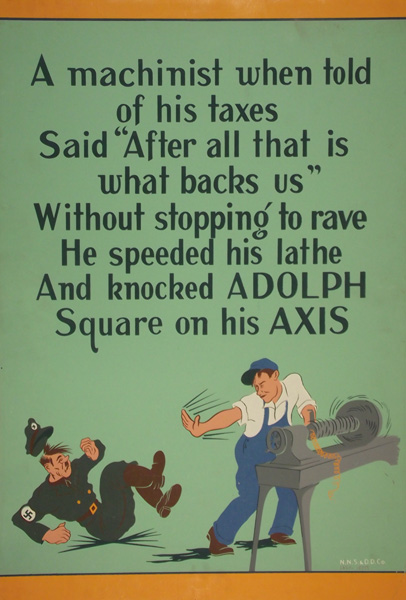 The first poster is one we acquired from Goodyear Tire and Rubber Company in 1962. There is no information at the bottom of the poster and I have not found another one online, so I don’t know much about it, but I love the imagery of the messy pig. The second came to us from the shipyard and was used to encourage their employees to work hard to help defeat the Nazis. The line “And knocked Adolph square on his Axis” cracks me up every time! The third poster is from 1945 and encourages sailors/soldiers to get an x-ray done. I guess the idea is that if the big burly guy in the poster is willing to get his done, you should too. It’s great that he is so happy with himself and sits there and smokes. If only he knew what we know these days!