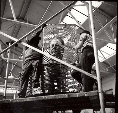 这张图展示了1964年2月Hog岛灯塔镜头在我们的主要画廊空间的重新组装。这个镜头是借给我们的,但我们现在拥有这个镜头,它曾经在查尔斯角灯塔,可以在我们的主要大厅看到。当我看到这张照片时,我忍不住笑了,因为镜头放大了后面那个人的头,让他看起来很搞笑。最棒的是,他可能根本不知道。