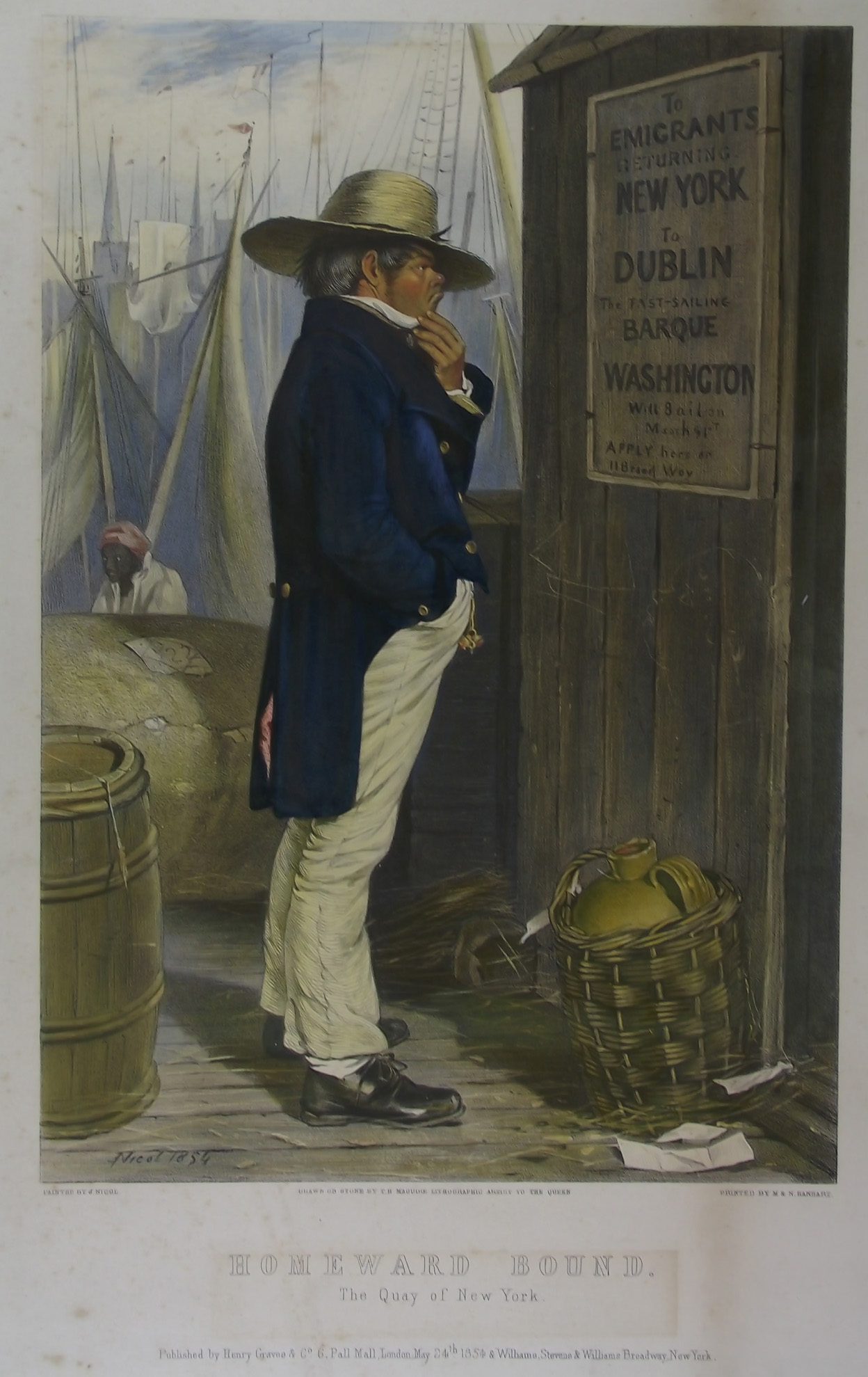 I think what I liked most about these two prints is what they imply. The first, titled “Outward Bound”, shows a man who is clearly poor and fallen upon hard times studying an advertisement for a ship to New York and holding what is most likely his last coin. The second image shows the same man (at least I assume it’s the same man) cleaned up and well dressed, clearly much better off than he was in Ireland, looking at an advertisement for a ship back to Ireland.
