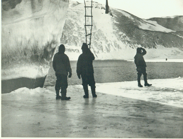 在左边,我们看到英国南极探险队的三名队员从头到脚裹得严严实实,站在靠近船头的一块浮冰上。