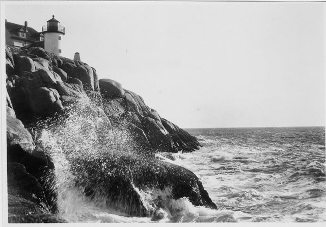 在这里,苍鹭颈灯塔与海洋溅在岩石上。这张照片是由拉尔夫·史密斯拍摄的,他的笔记表明缅因州的灯塔建于1854年,高28英尺。