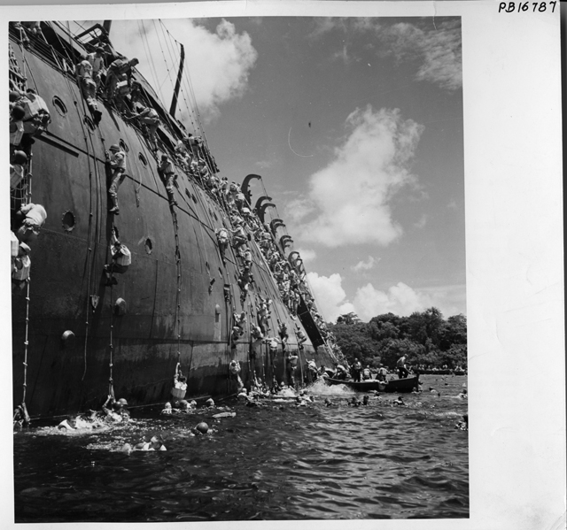 在这里,士兵和水手从船舷上爬下来柯立芝总统1942年10月26日,他们弃船而去。