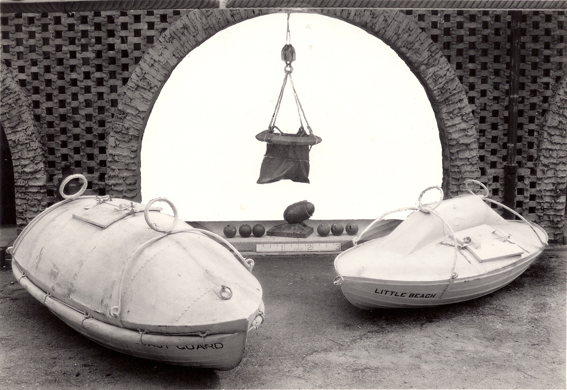 1939年在我们的庭院展览上展出了一场拯救生命的展览。两辆小型救生车仍在展览中,一辆在我们的国际小船中心,另一辆在弃船中心。当一艘船在近岸处沉没时,救生车被用来救人。一根缆绳将从岸边系到船上,汽车将被拉上岸,车上的人也在里面。悬挂的马裤浮标也在《弃船》中展出。