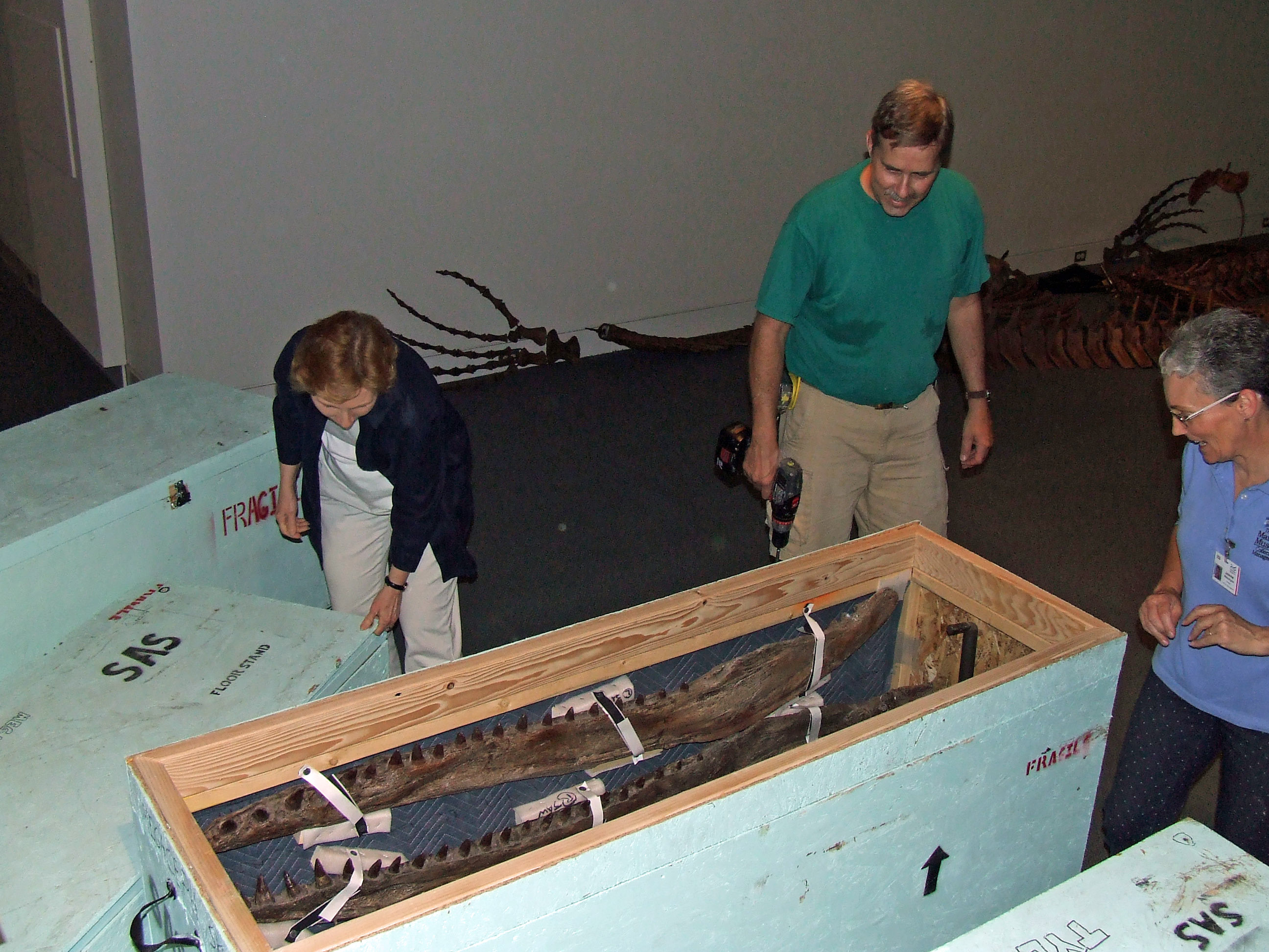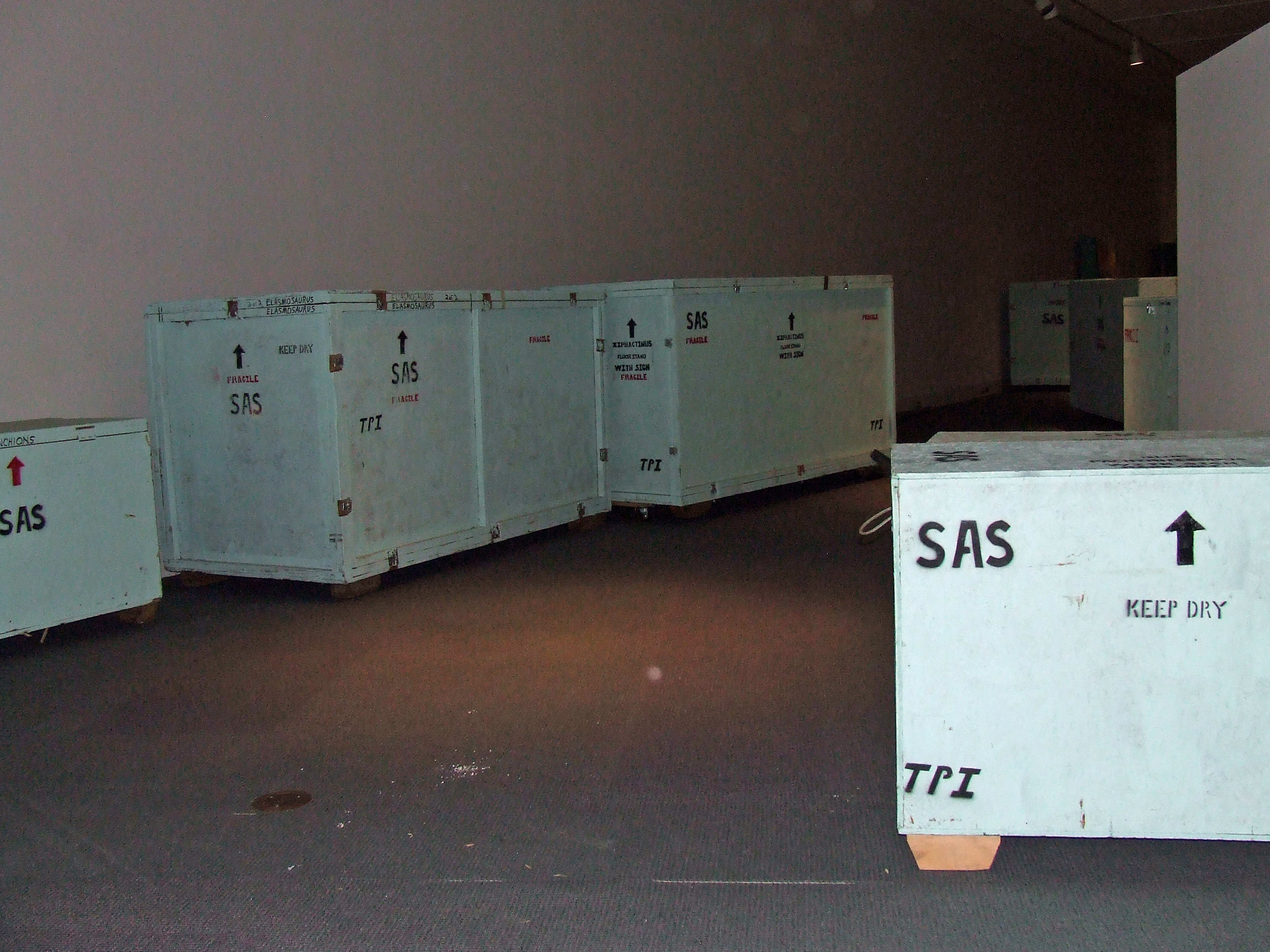 我们最新的展品在这里!嗯,在博物馆里,在很多很多的箱子里——超过100个箱子。今天一大早,箱子和我们所见过的最大的移动卡车载着远古野蛮海洋和深海恐龙的所有部件开进了城里。在用家具推车、托盘千斤顶和叉车工作了几个小时后,板条箱已经进入了画廊,开箱和安装工作已经开始。安装过程只需要几天时间,然后需要调整灯光,对地毯进行吸尘,对工艺品进行除尘。所有的工作都在为5月23日(星期五)博物馆成员和5月24日(星期六)公众的“野蛮人”盛大开幕做准备。这是目前为止的一些作品的照片。感谢您的阅读,请继续关注我们在水手俱乐部的收藏乐趣!