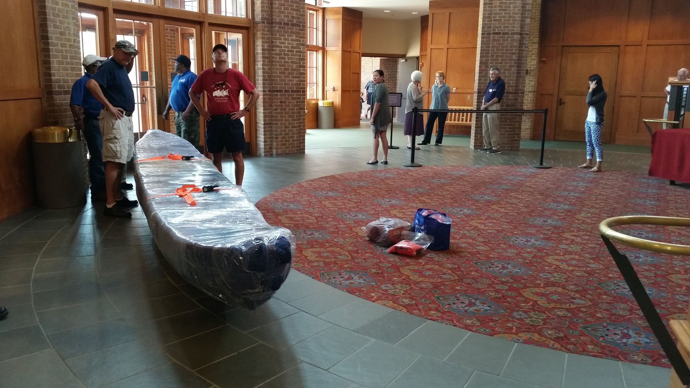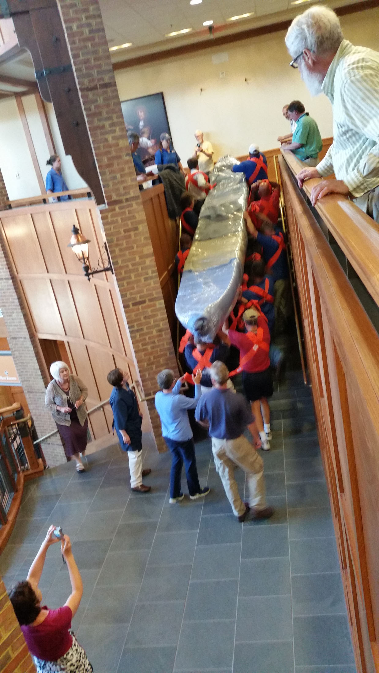 大多数物品都很容易到达二楼的指定空间,但有一艘船,名叫老夫人,对于电梯来说太大了,不得不被拖上楼梯。为了做到这一点,我们购买了一些新的带子,可以沿着船的底部运行,这将给人们一个很好的处理,同时保护脆弱的船的两侧。然后我们让十个人沿着两侧用带子把她抬起来拖上楼梯。幸运的是,一切进展顺利,她没有太大惊小怪地来到了展览区。