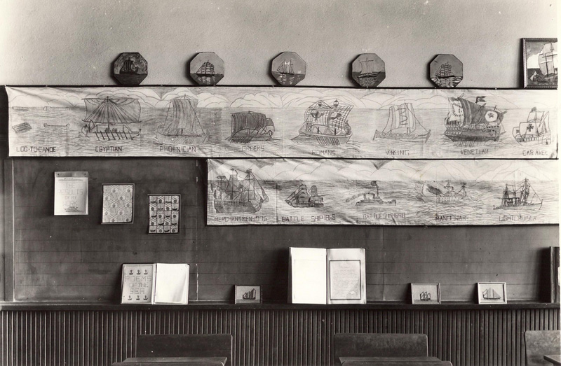 这张照片展示的是一个教室展览,灵感来自于1936年参观水手博物馆。不知道这是哪个学校的,但这面墙看起来很棒!