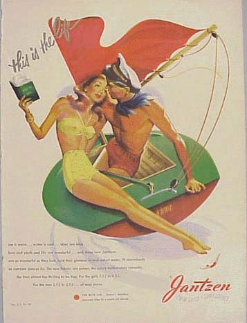 啊,爱就在空气中,就在杂志上Jantzen泳装的广告中。标题“这就是生活,阳光就是温暖....。爱青春和生命都是美好的”,“新面料是强有力的,颜色故意浪漫。”阳光的黄色、绿色和橙色正是我们所需要的,让我们梦想温暖的天气。这是为泳装历史和海滩浴礼仪展览购买的13个泳装广告之一。并不是所有的都在当时展出,但他们为我们的标签副本的策展人提供了背景信息,他们绝对是我们的收藏中的一点乐趣。(2001.06.03)