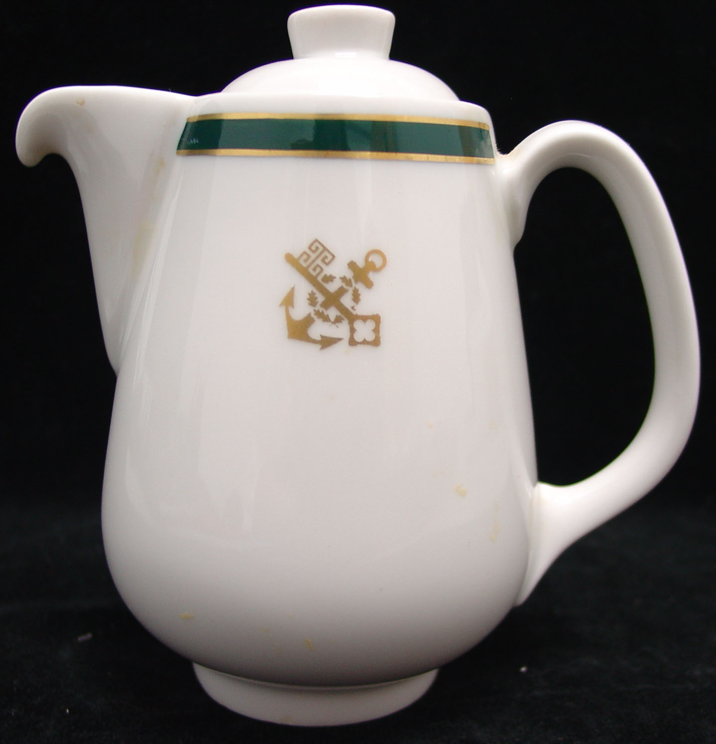 没有巧克力的情人节算什么?这是一瓶大约1953年的个人咖啡巧克力壶测量只有4英寸高与黄金交叉钥匙和锚设计的北德国劳埃德线。用于头等舱乘客服务,由德国罗森塔尔公司制造。(1973.60.33)