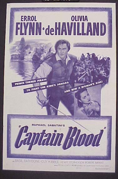皇室,海盗,可爱的女士,海上战斗,背叛,救赎和爱。这些都是1935年黑白电影《血队长》的一部分,这是1953年在影院放映的电影海报的重印版。1997年为准备海盗展览而购买的一组海报中的一张。碑文写着埃罗尔·弗林,奥利维亚·德·哈维兰,王子成为海盗,与国王的舰队作战并赢得了一个女人的吻”。(1997.23.01)
