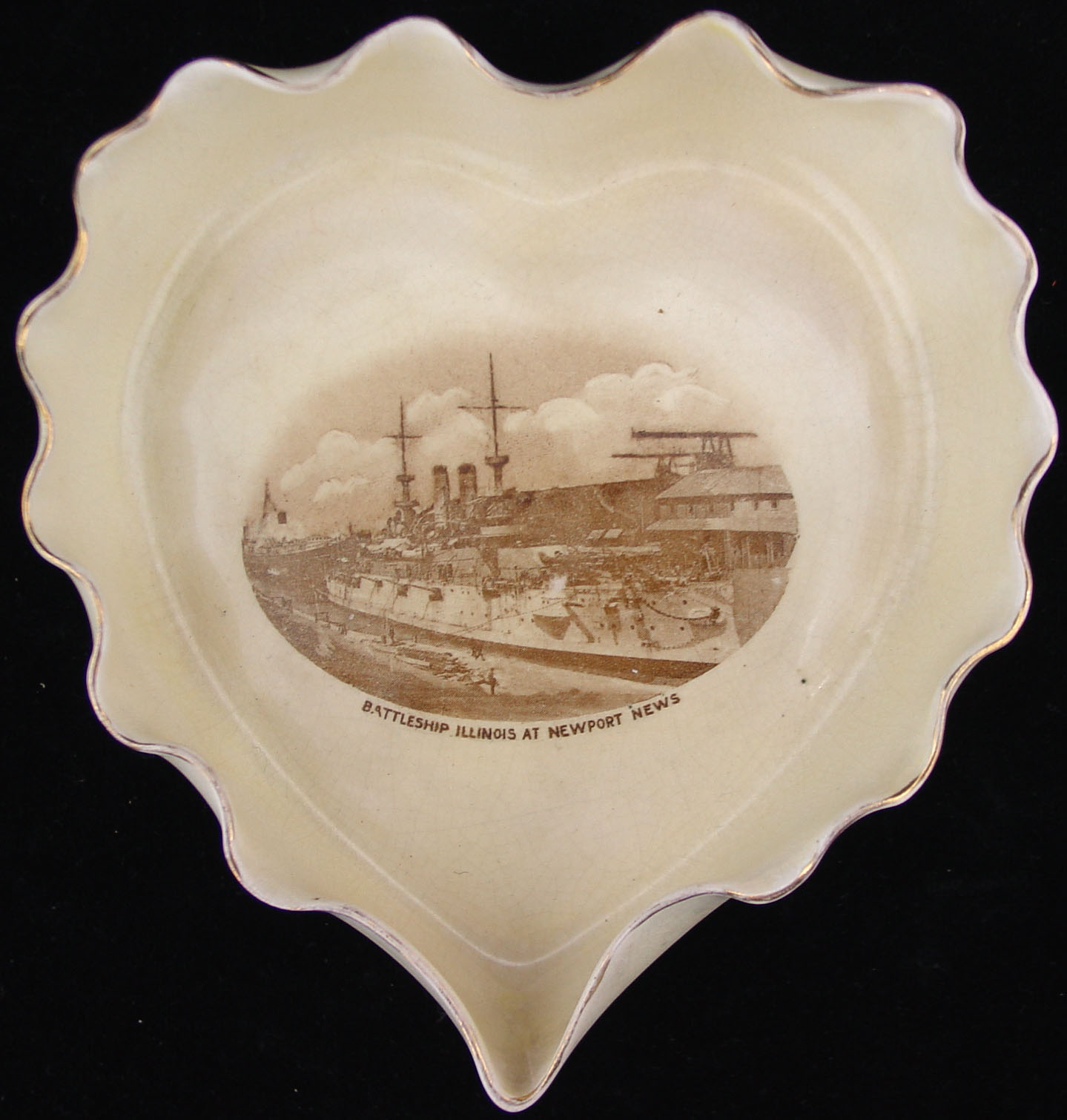 在新港新闻造船和干船坞公司,有一个奶油色的Bon Bon盘子,上面装饰着美国伊利诺伊号战舰的深褐色转印图案。这种装饰也被称为Transferware,这是18世纪中期在英国发展起来的一种技术th世纪。一个雕刻的金属板是用来打印在纸上的设计,然后纸是用来转移湿墨水到陶瓷表面。为了固定设计,物体在低温窑中烧制。在此技术之前,陶瓷设计是手工绘制的。根据一些资料,Bon Bon可能从17世纪就存在了,它的名字是法语单词“好”的复制品。这些好吃的甜点通常是在柔软的中心涂上一层薄薄的巧克力。伊利诺伊号战列舰于1898年下水,1901年服役。732年(FN)