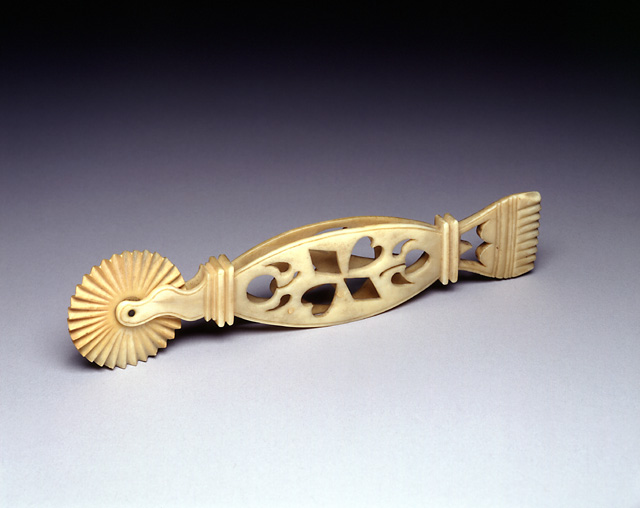 一个来自大海的礼物,雕刻成锯齿状车轮的鲸鱼象牙,也被称为馅饼卷边器。用来把上下馅饼皮卷在一起,这样在烹饪的时候馅料就不会漏出来。很好地装饰着心钻石和玫瑰花结。这件作品唯一不是天然材料的部分是小的金属针,把车轮到手柄。锯齿状的车轮是水手们在长途航行时雕刻的物品之一。给那些留在家里的人一份礼物,提醒他们所爱的人在等着他们,或者只是一些打发他们时间的东西。(19)