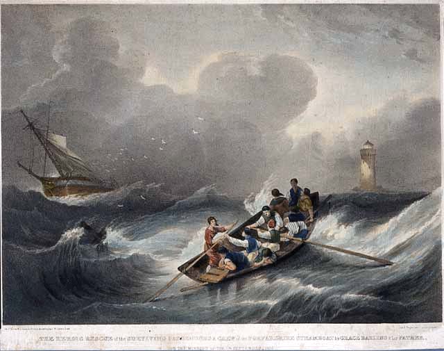 一幅彩色平版印刷机,大约在1840年,庆祝22岁的格蕾丝的决心亲爱的以及她在1838年9月7日努力拯救失事的船福法尔郡的幸存者。凌晨3点左右,在一场猛烈的风暴中,福法尔郡号撞上了位于英格兰诺森伯兰郡海岸外的法恩群岛上的岩石。八名船员和一名乘客设法乘坐一艘救生艇逃生,其余的人在船被风和海浪推来推去时紧紧抓住岩石和残骸碎片。他们在黎明时分被格蕾丝发现,她说服她的父亲,灯塔看守人威廉·达林,他们需要努力帮助幸存者。尽管他担心他和他娇小的女儿能在风暴中控制住一条划艇,但他们还是出发了,救出了9名幸存者。在估计的43名遇难者中,许多尸体从未找到,而在找到的尸体中,一些从未被确认身份。这幅画于1946年被博物馆购买。3301年(LP)