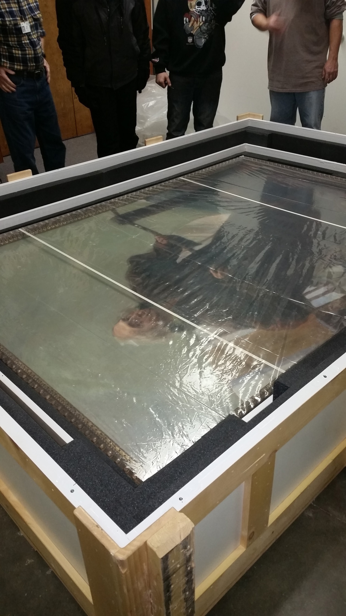 在经历了这么多的旅行之后,这幅画于上周回到了家,在我们出色的工作人员的帮助下,我们打开了它(箱子非常重!)现在它回来了,我们将把它挂在我们的探索时代展览的墙上,我们现在有一个复制品挂在那里。
