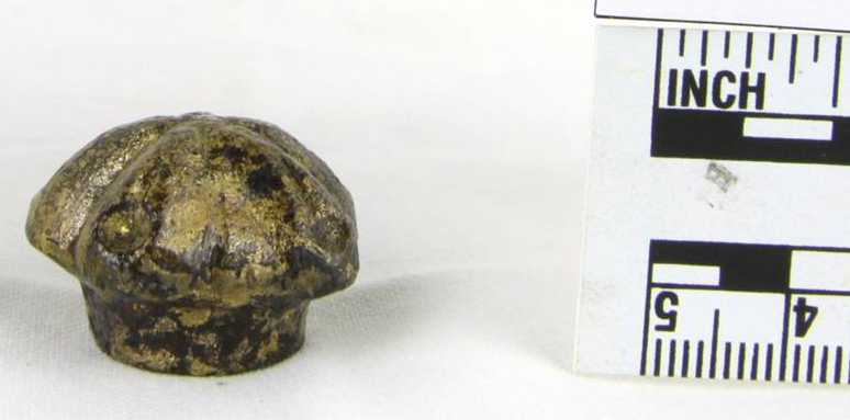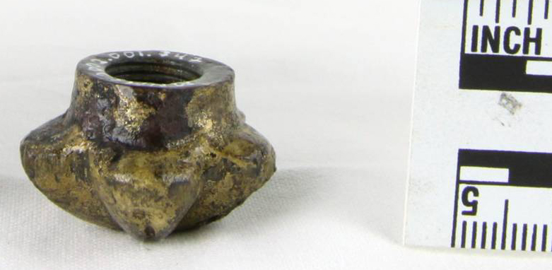 关于这个藏物我们知道些什么?它是从美国军舰中发掘出来的监控炮塔完全嵌在厚厚的混凝土沉淀物层中。它不依附于任何东西。它是由铜合金制成的,像青铜或黄铜。它的形状是一个五角星与圆角边缘。每个点上都有一个小酒窝。藏物大约3/4″高,3/4″宽。线程已经被切割到工件中,表明它可能被拧到另一个对象的末端。它看起来是装饰性的,但也可能是实用的。它可能被安装在炮塔的某个部件上,也可能是那晚被带到炮塔的另一个物体的一部分监控在北卡罗来纳州哈特拉斯海域沉没。