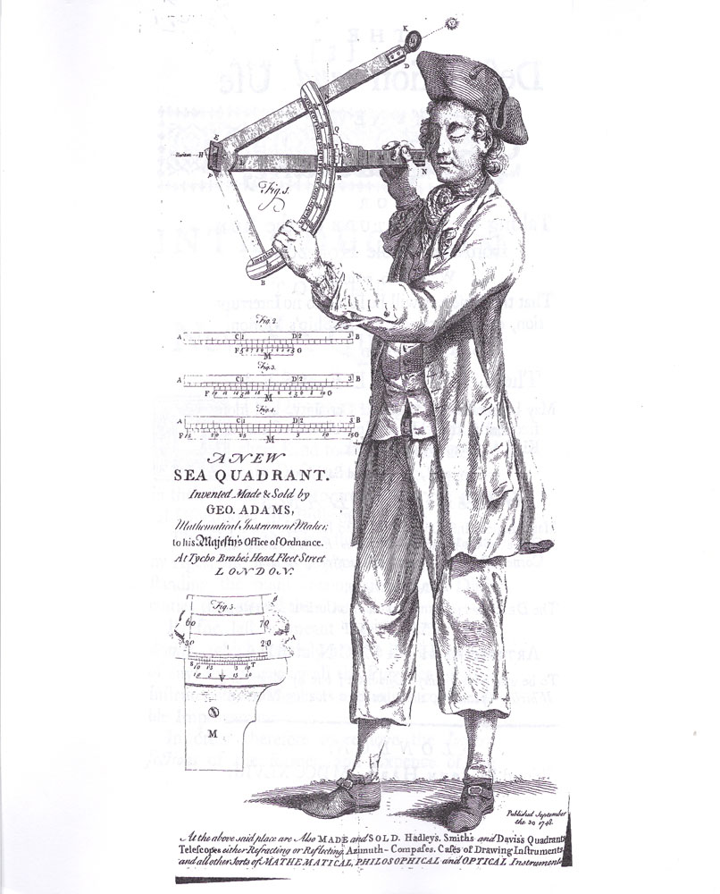 亚当斯表示,他创造这台仪器的目的是为了纠正使用后标的“不便和困难”,并提供一种比昂贵的八分仪更便宜的仪器。他和另一位仪器制造商本杰明·科尔(Benjamin Cole)都试图创造新的海洋象限。尽管他们做出了努力,但这种新仪器从未被航海家们欣然接受,这导致了它们的稀有。我之前说过,这是乔治·亚当斯已知的唯一海洋象限,本杰明·科尔只知道三个。