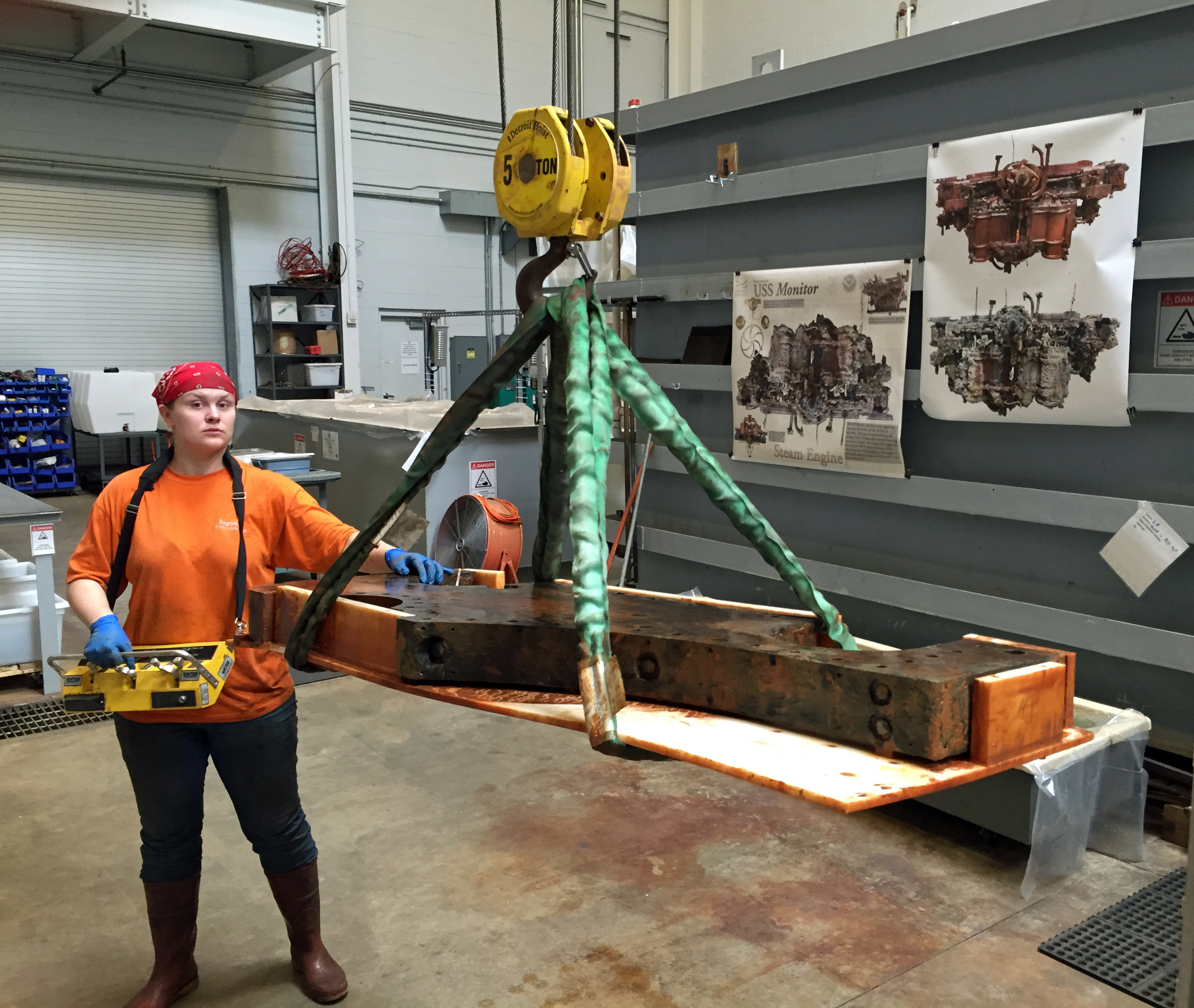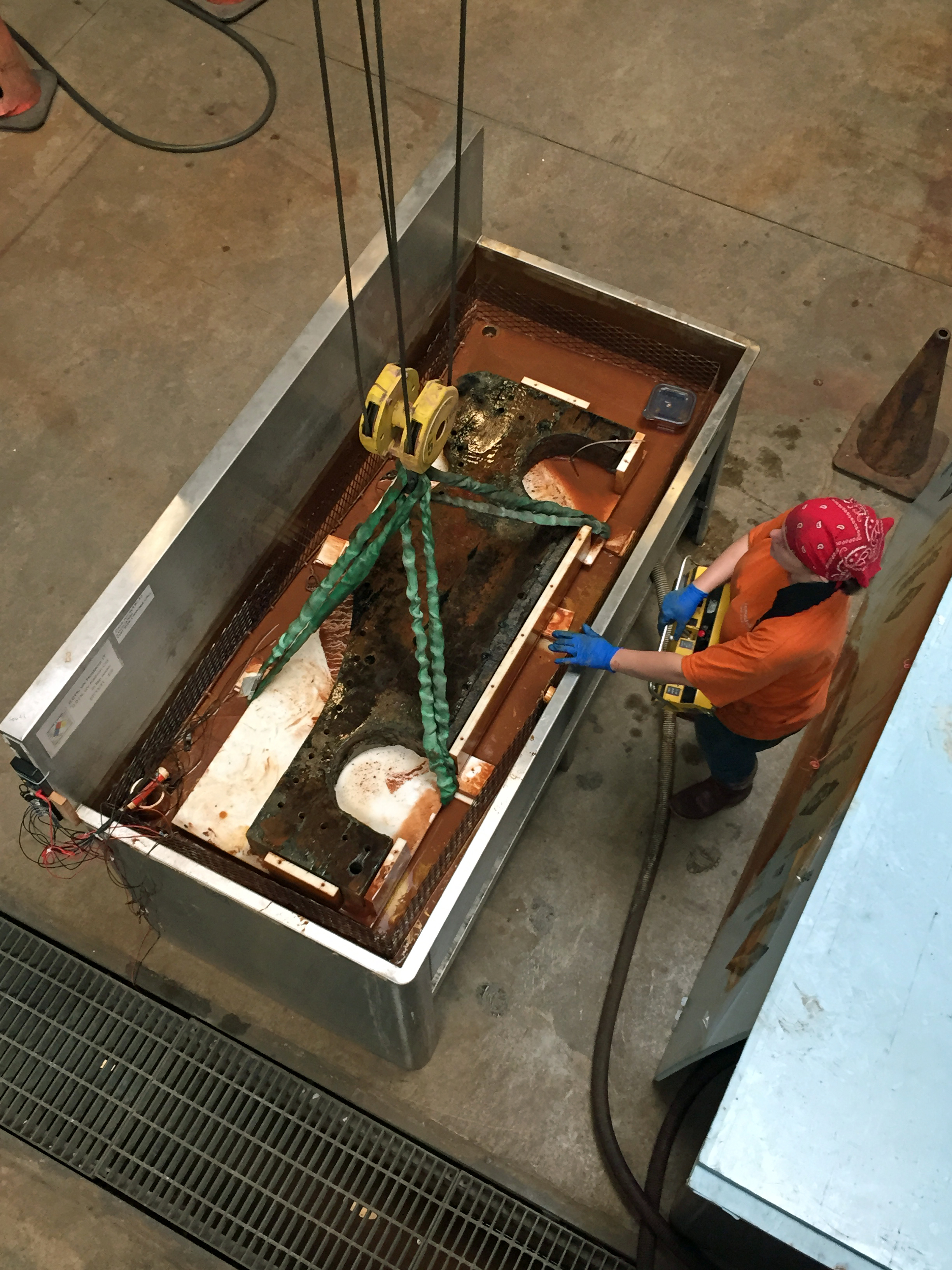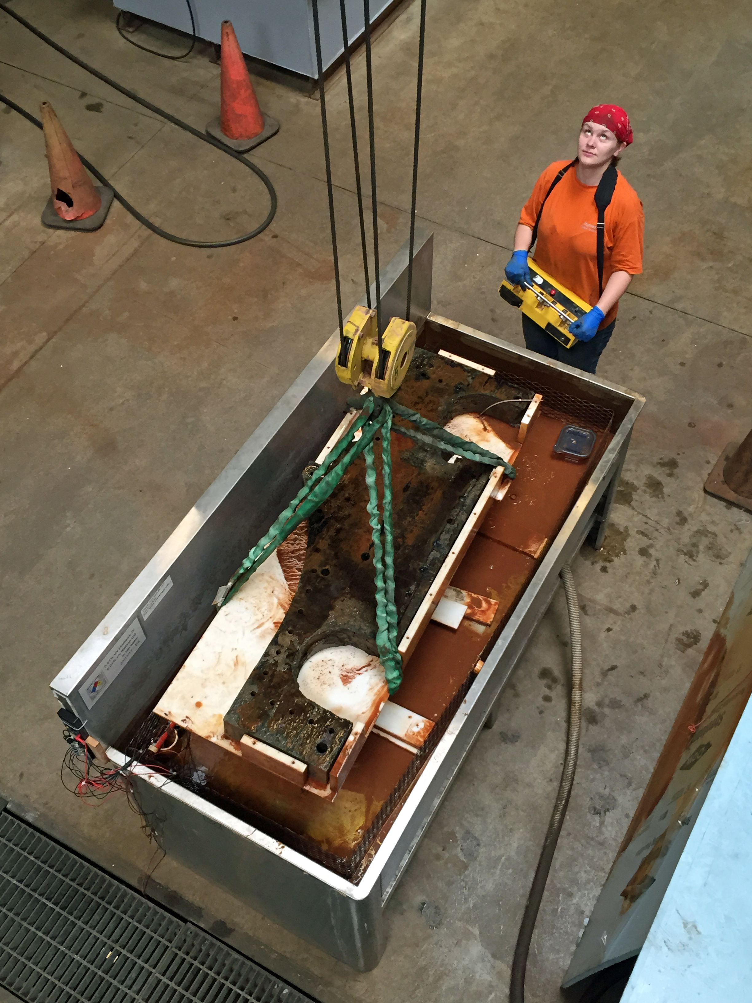 今天早上,凯特从脱盐罐里吊出了一架橡木炮架,准备进行一轮减盐和机械清洗。我爬上了处理槽上方的梯子,拍下了凯特用吊车把橡树木料搬到湿实验室另一个区域的处理平台上的一系列照片。是的,那确实是我们的吊车的遥控器。很酷,对吧? !