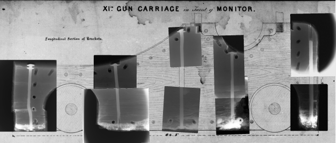 凯特又回来了。她正在努力对橡树的侧面进行进一步的机械清洗,为拆除穿过木头的铁螺栓做准备。螺栓牢牢地固定在巨大的橡木木材,形成了每个炮架的很大一部分。这是我们制作的一系列x光片,显示了覆盖在炮架原计划副本上的铁螺栓: