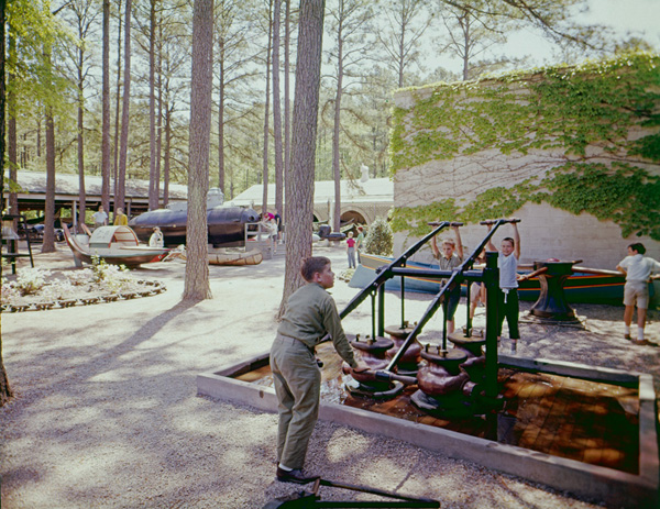 这张照片展示了我们的庭院,它当时被用作画廊空间(现在主要是出租空间)。有些物品是人们可以互动的,包括美国航空母舰上的手动舱底泵哈特福德.可追溯到1965年。