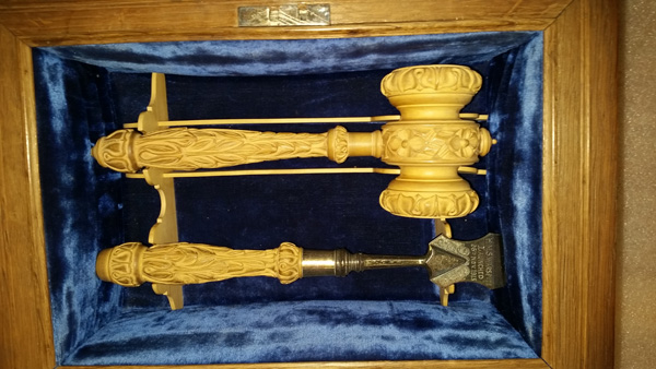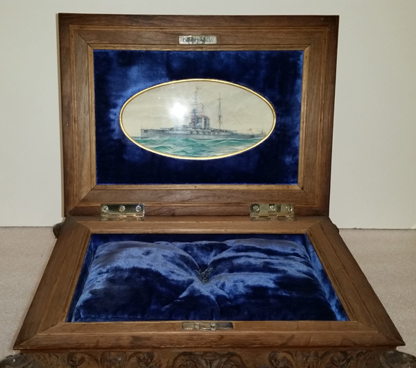 这种类型的盒子用于包含用于帮助发射船的槌槌和凿子,然后将其赠送给该船的赞助商。对于来自HMS Warspite的盒子,赞助商是英国政治家奥斯丁·张伯伦爵士的妻子Ivy Muriel Chamberlain(NéeDundas)。可以看到她的照片这里。