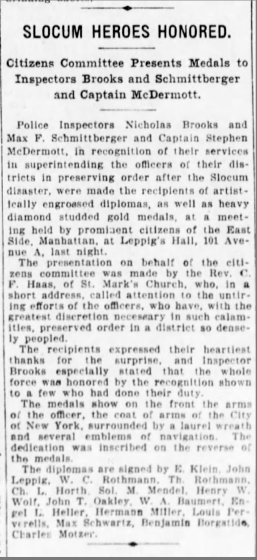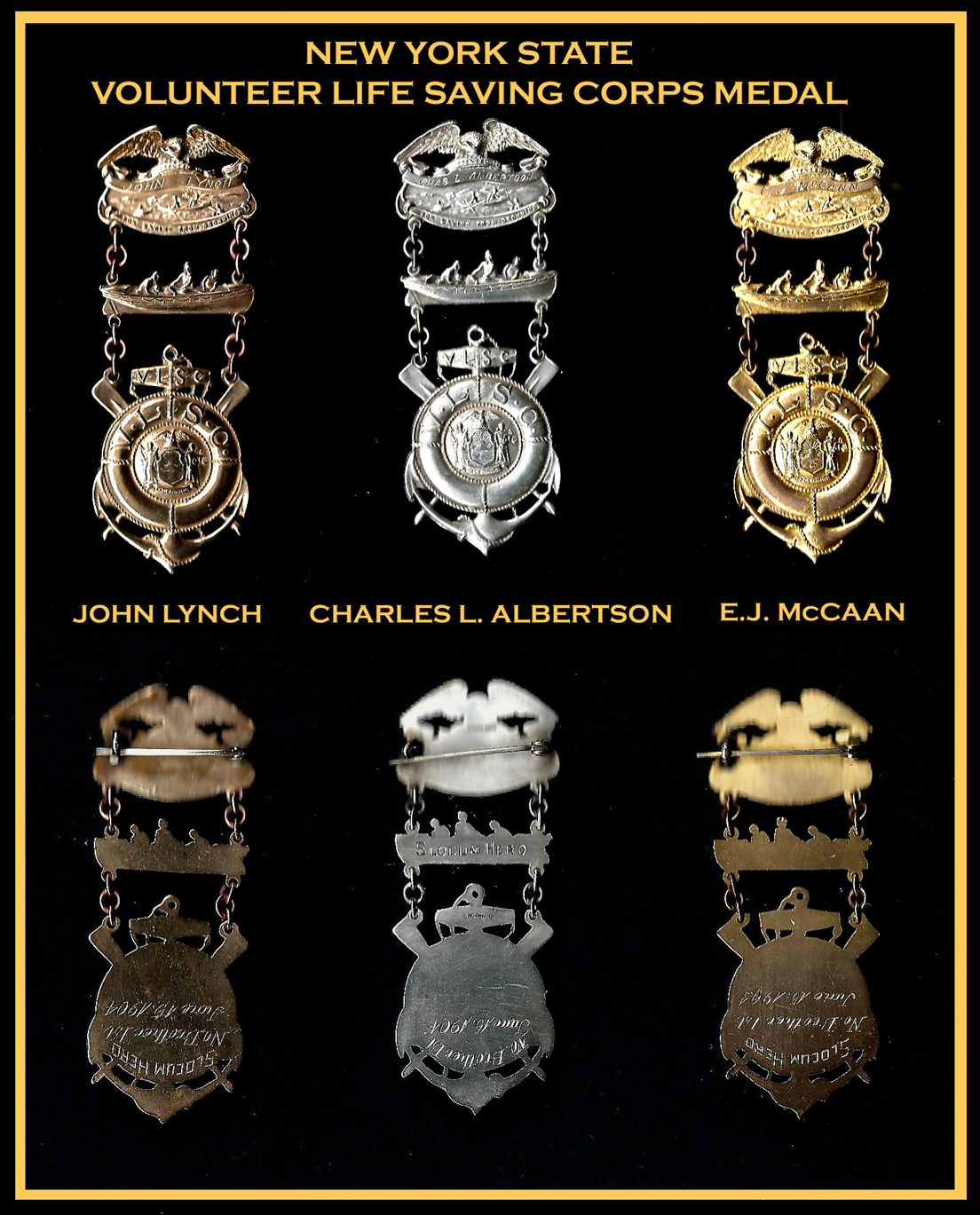另外三枚奖牌由纽约州志愿救生队颁发给约翰·林奇、查尔斯·l·艾伯森和e·j·麦克肯,以表彰他们在斯洛克姆灾难中拯救生命的努力。