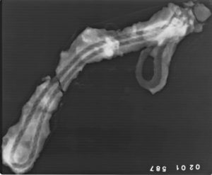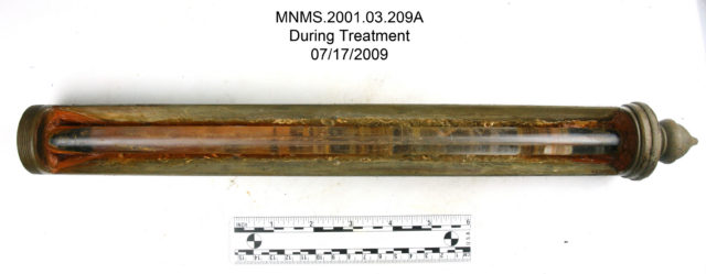 第二个原因是安全。号航空母舰监控装备了武器和充满水银的发动机仪器。所有这些在他们在船上的生活中都有潜在的危险,然而即使在今天,它们仍然可能是危险的。考虑到这一点,我们用x射线照射玻璃管,以确定它是否含有汞。管子可能来自一个压力表,并且完全被腐蚀和凝固所覆盖。如果它含有重金属,由于金属的密度,它在x射线上看起来就像一个荧光棒。我们没有检测到水银,但仍然会小心处理。