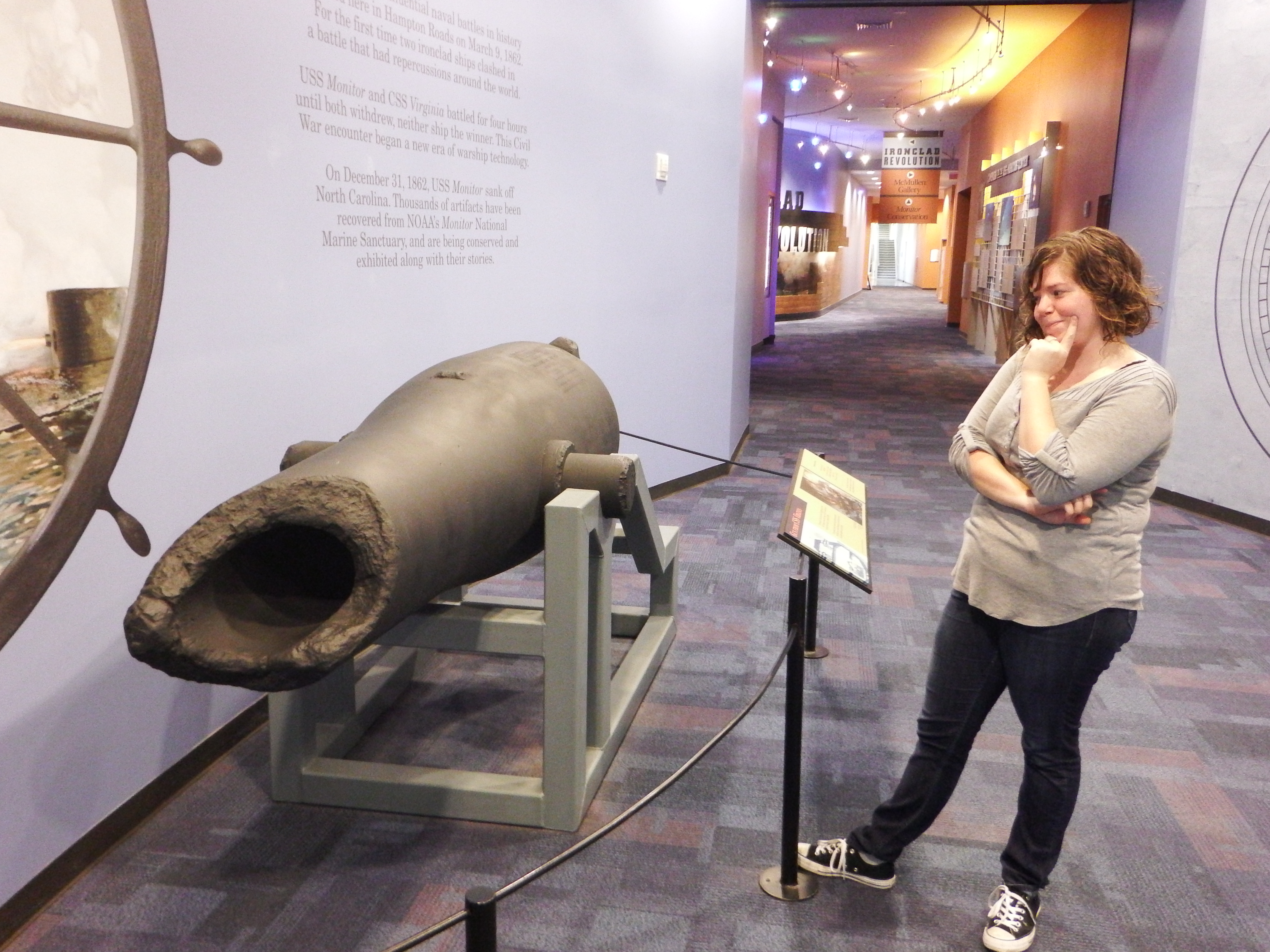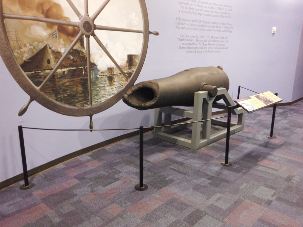 上周我休息了一下干冰清洗工作在“维吉尼亚州“一种ix英寸的达尔格伦炮弹枪,它坐落在铁甲革命展览的入口处。它是和美国海军一起被发现的梅里马克被邦联军使用,并被命名为CSS维吉尼亚州在汉普顿公路战役期间(1862年)。这是一件吸引人的迷人物品。不幸的是,它也容易吸引游手好闲的人。我的工作是把桶边上的油腻指纹去掉。这让我思考我们如何保护文物,尽管我们在博物馆周围设置了“请勿触摸”的标志,但游客可能不理解为什么这是一条如此重要的规则。