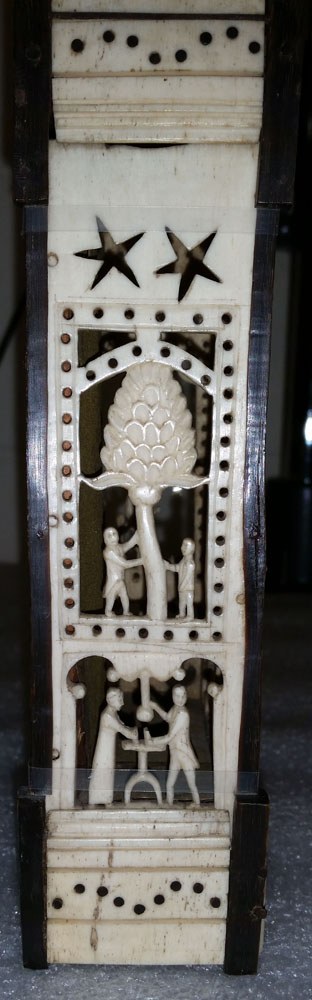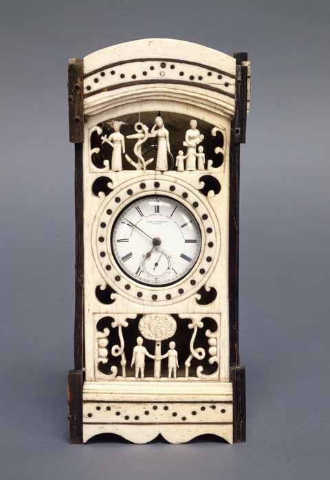它由骨头、鲸须、木材、金属和纸张制成,在1939年被我们的一位买家购买。几年后,我们的一位策展人开始研究这件作品,试图发现查尔斯·b·托比可能是谁。在与新英格兰的各种机构联系之后,人们认为我们的人可能是查尔斯·托比,他于1798年出生于马萨诸塞州南塔克特的威廉和南希(爱尔兰人)托比。1822年3月11日,查尔斯·托比成为这艘船的船长亚当斯夫人驶往太平洋的南塔开特岛。在1822-1823年的某个时候,这艘船在日本海岸附近烧毁,船上所有人全部遇难。如果托比以前乘坐过这艘船,那么他很可能是我们的时钟持有者的艺术家。1817年10月25日,亚当斯夫人在1819年晚些时候,他去太平洋旅行,并返回了家,这与我们的作品所处的时间和地点相吻合。