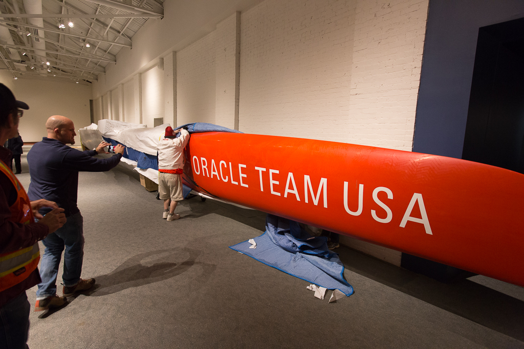 1月30日AC72终于到了!我们的工作人员对此感到非常兴奋,因为我们都拿出了自己的照相手机,所以它可能是藏品中最上镜的物品。运送货物的卡车有三辆,其中两辆是我们当天早上卸货的,另一辆是当天晚些时候到达的。