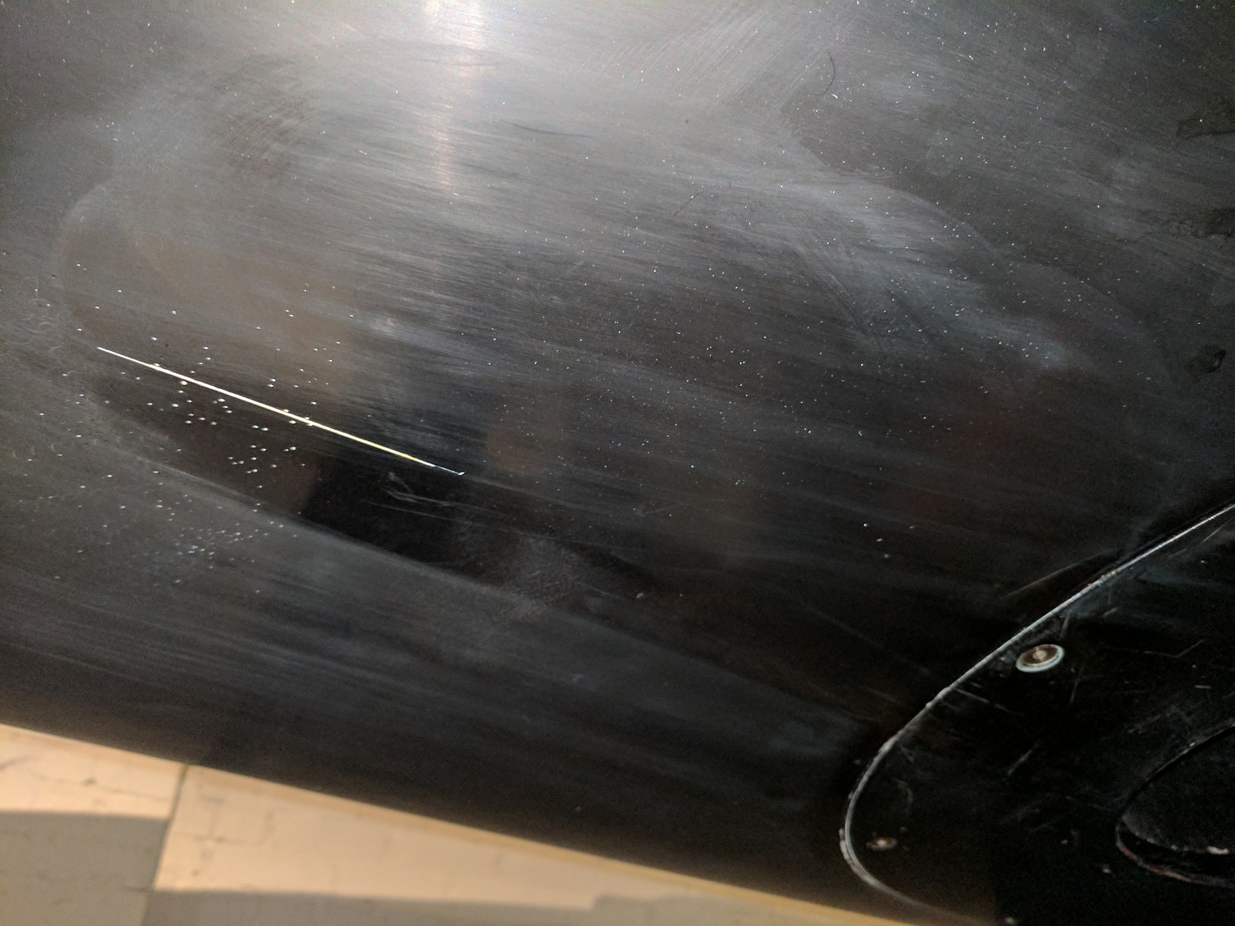 这时我知道表面上有些东西“不太对劲儿”。我又打电话给Beasley医生,告诉他们我努力的结果,并说如果我不知道得更清楚的话,我发誓表面是被故意损坏或移除的。如果你看看下面的图片,你就会明白我的意思。这张照片显示了正在清理的船体的一部分。左侧刚刚被水和一滴Triton X-100(一种非离子表面活性剂)擦拭过,右侧显示的是干燥的船体。难道我是唯一一个看到漂亮的长水平磨蚀的人吗?这些磨蚀使表面看起来像是用某种超细砂纸打磨过的吗?Beasley博士的工作人员也认为表面似乎被损坏了,并说恢复表面效果的唯一方法就是涂上一层新的凝胶涂层——但我们显然不会这么做。