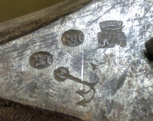 问题涉及刀片上有四个非常独特的邮票的寄宿斧(集合中只有一个其他寄宿斧有一个标记 - 一个立即识别的冲压锚把它奉为1833年的法国型号)。邮票上有一个带顶的“M”,一个带顶的“B”,一个看起来像抓钩的锚,还有一个模糊不清的带顶的“什么或其他东西”(不好意思用了这个术语)。一开始我们以为是鹰,后来又以为是大象,后来打扫了一下才发现是一对装饰性的字母;一个字母“R”后面跟着一个看起来像“S”或“F”的字母。