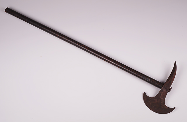The “RI” stamp is for Regno d’Italia/Royaume d’Italie (Italian/French) which indicates the boarding axe was made in the Kingdom of Italy sometime between 1805 and 1814. The two smaller crowned marks (the “M” and “B”) are inspector’s marks that are associated with the armourer Paolo Landi which was a private company manufacturing arms for the state.