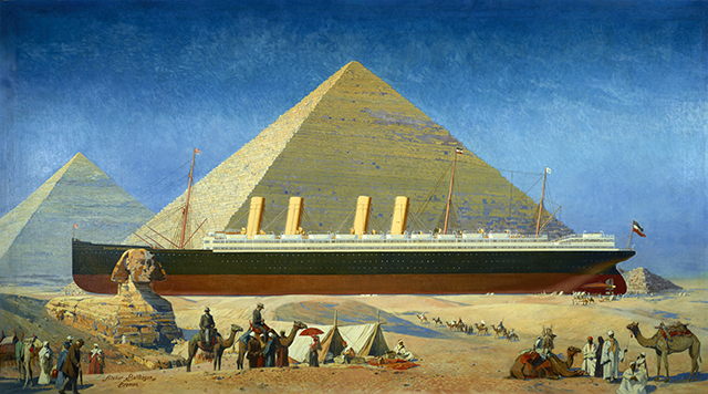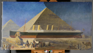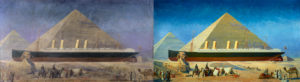 注意这幅画的黑暗。很难看出,但金字塔上有撕裂,就在第二次烟囱上方。帆布在担架上松动,部分艺术家的签名(以及人们和骆驼脚)被缠绕在底边,遮挡了它们。