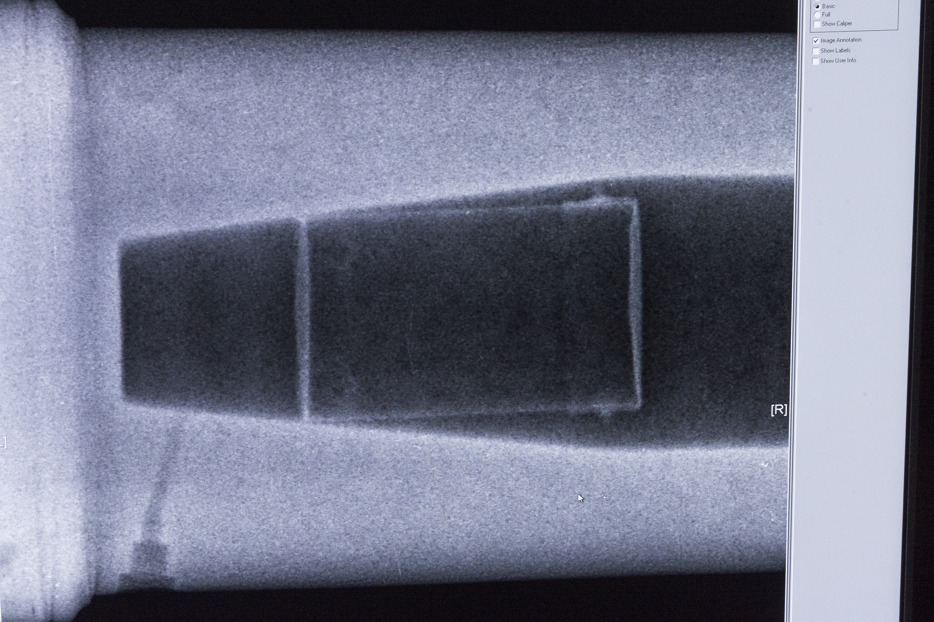 我们上周四取回了x光片,图像非常清晰,甚至在CR系统的高分辨率电脑显示器上都能看到最细微的细节。图像清楚地显示大炮没有上膛,让我们更好地了解了卡在枪管里的物体的形状。
