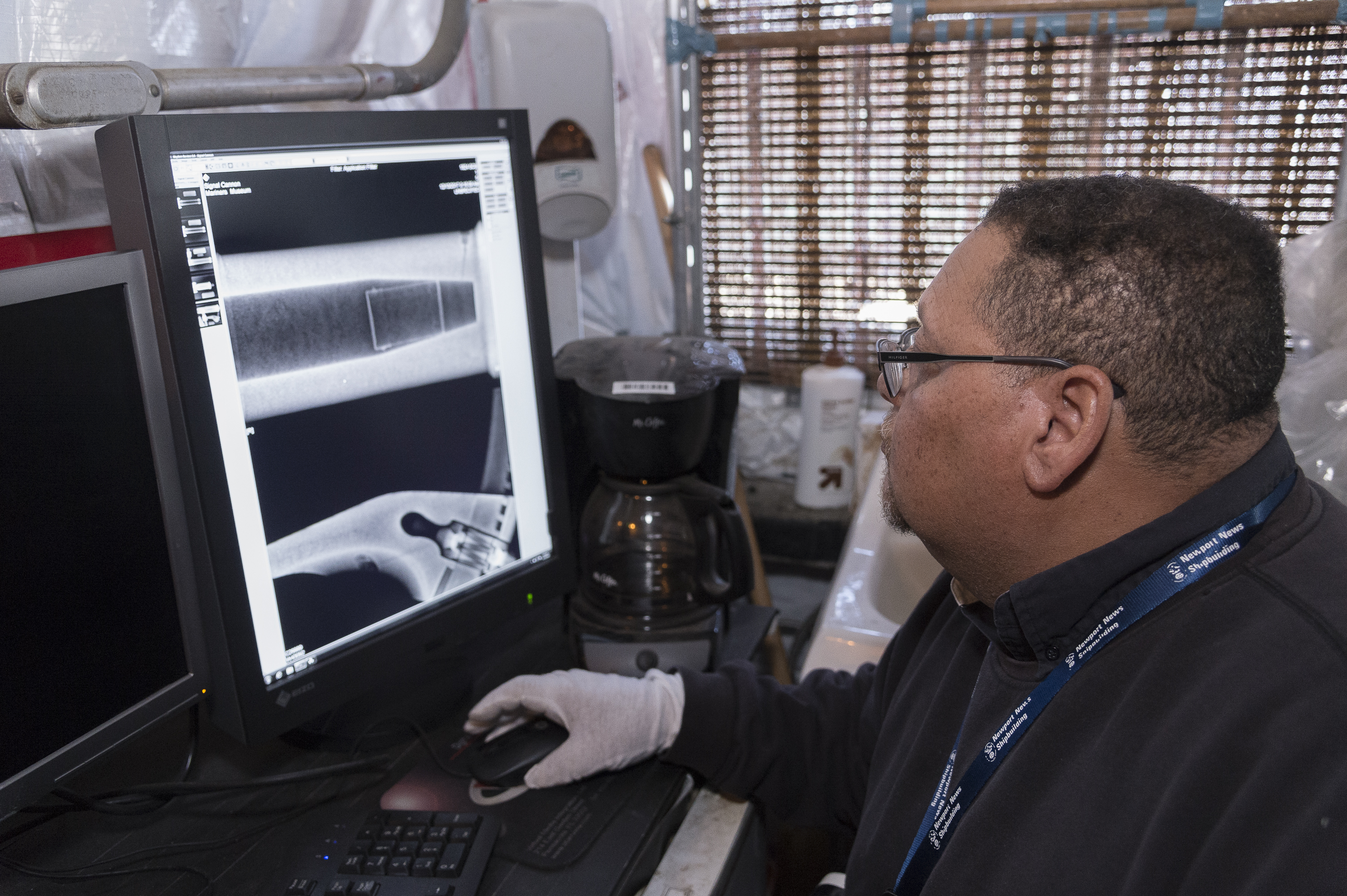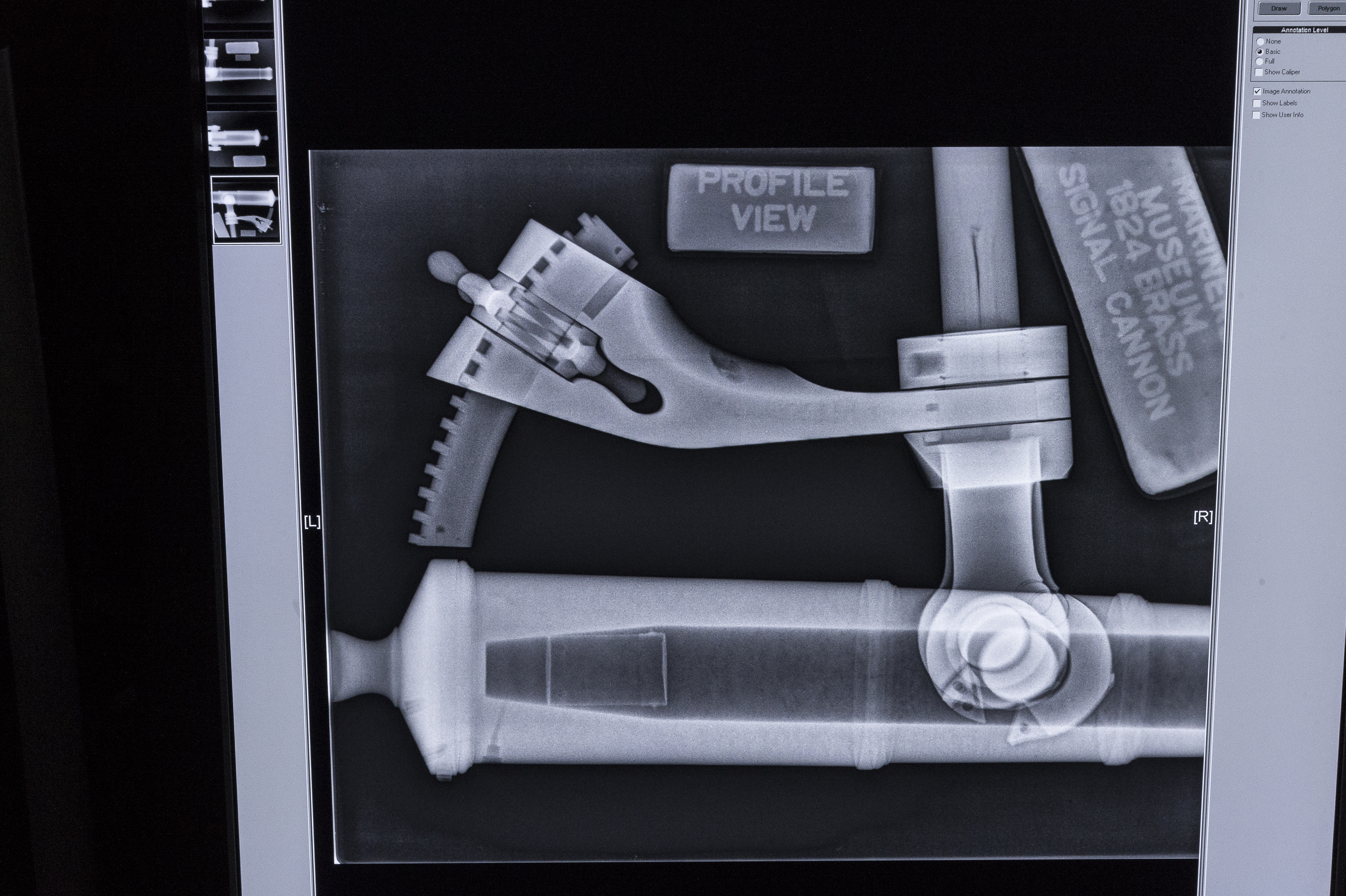 上周JJ Bosco和Mike Bryant从NNSBD的NDT工程和检查部门过来,拿起大炮,并把它带到船厂。第二天,他们的团队对大炮和其他一些我们需要帮助的物品进行了计算机放射成像(CR)。