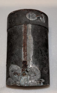 该件是一个小筒形对象2-1/8 "高1-3/8 "直径与一个焊接缝在一边。它有一个底部和一个小帽,也有一个焊接接缝。有两个小环路焊接到帽和两个在底部的罐。看起来这金属好像是在某个时间被罐装的。它的一个环带里还剩下一根小绳子。现在,普遍的共识是,它是一个小容器预先测量的电荷——有点像带式振荡器上的使徒。马克认为容器里装的火药不足以发射炮弹,但肯定能装够发出信号。